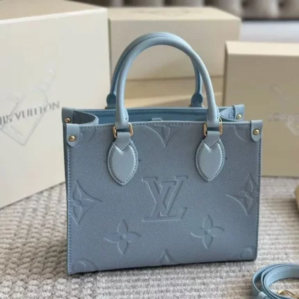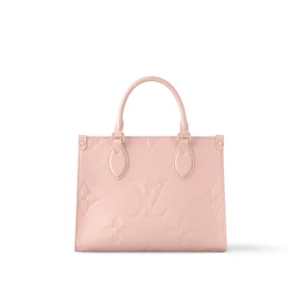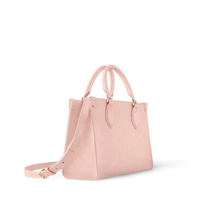 The OnTheGo PM is a tote-style handbag made from pastel-colored Monogram Empreinte leather with its distinctive Monogram embossing. The four