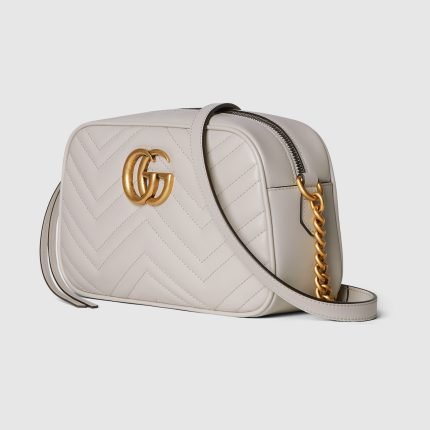 Made in matelassé chevron leather in a neutral shade of light grey, the now recognisable GG Marmont small shoulder bag