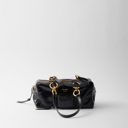 A new interpretation of the top-handle bag features a soft geometric shape and is made of shiny leather with a