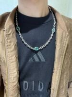 “The **hand-applied oxidation** and **raw-edged detailing** give this necklace an authentic vintage vibe, while the **substantial 8mm curb chain** (75g weight) ensures modern durability”.