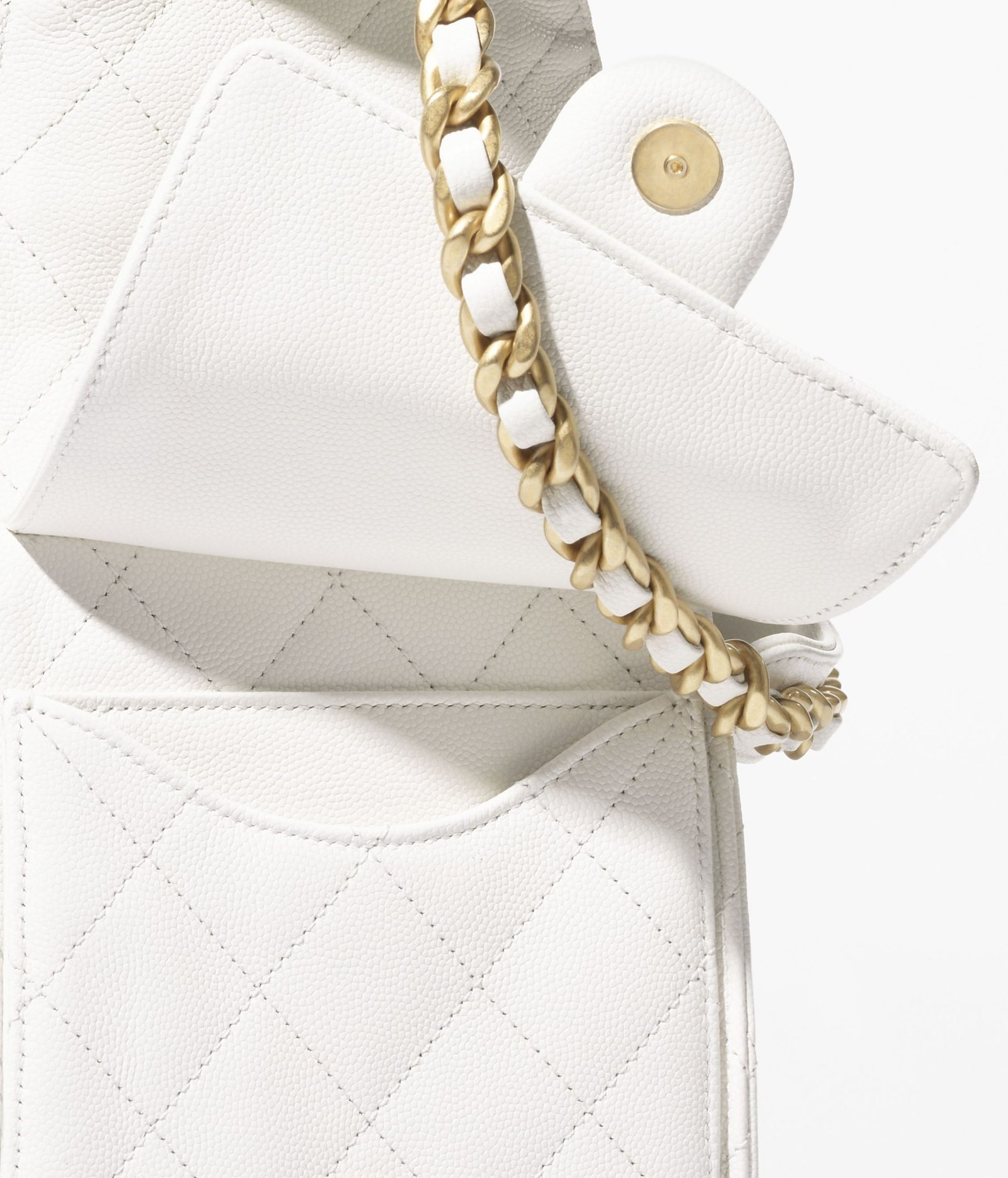 This Chanel Small 25 Hobo Bag is in white shiny grained calfskin leather with antique gold hardware, features signature diamond quilt, two exterior side pockets, drawstring closure, and a single interwoven antique gold and white leather shoulder strap.