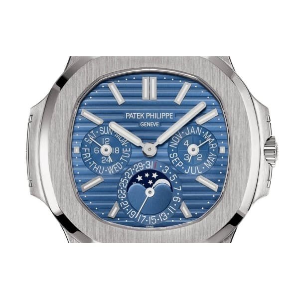 Unworn Patek Philippe Nautilus 5740-1G-001 White Gold 40mm. The watch has Blue Sunburst Dial w/ Golden hands and Fixed Bezel.