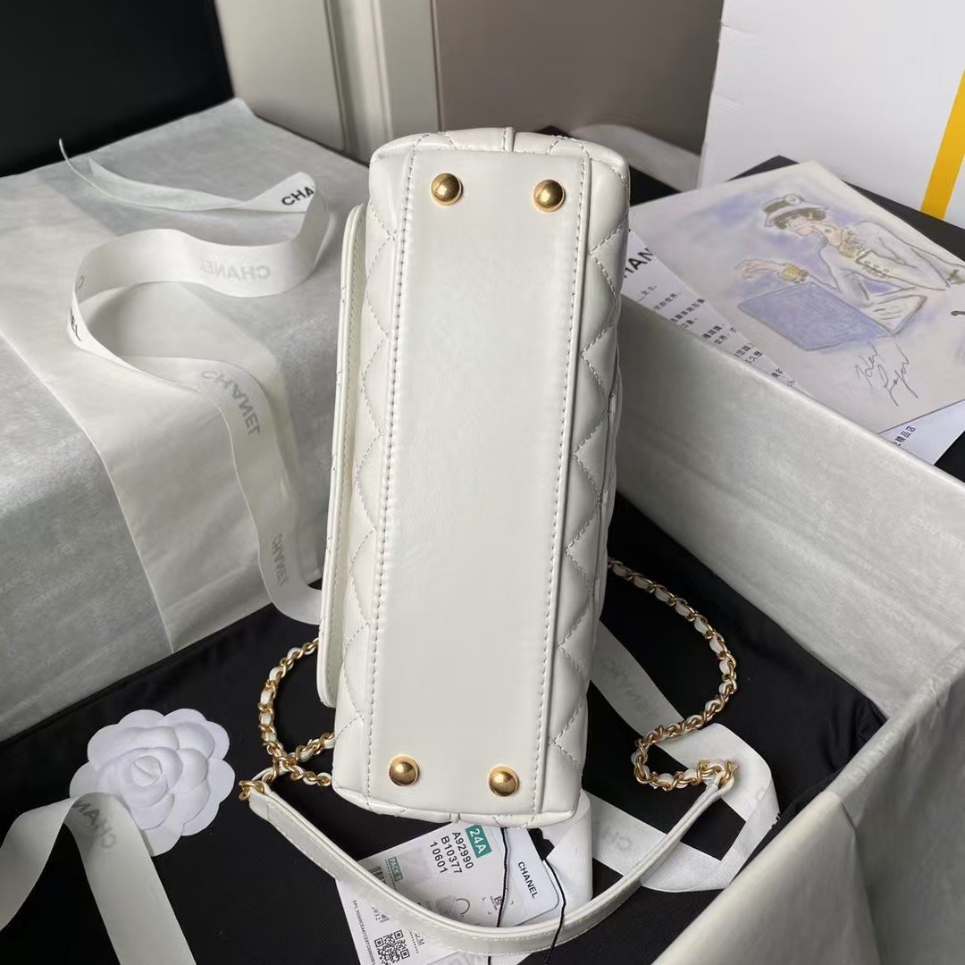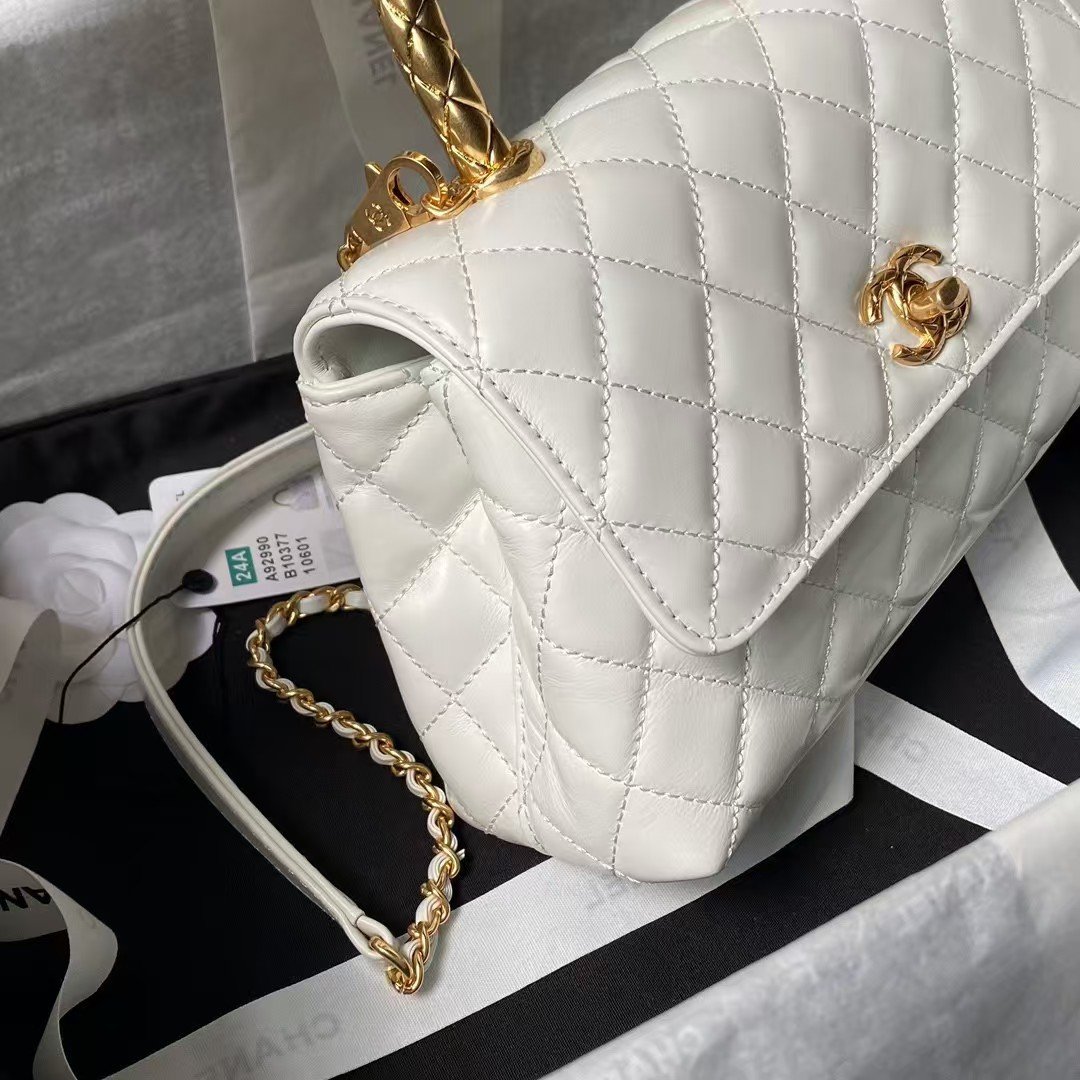 This small rectangular flap bag features a metal top handle and is made from white shiny calfskin with gold hardware, front flap with CC turnlock closure, half-moon back pocket, top handle and single interwoven antique gold chain link and white leather shoulder/crossbody strap.
