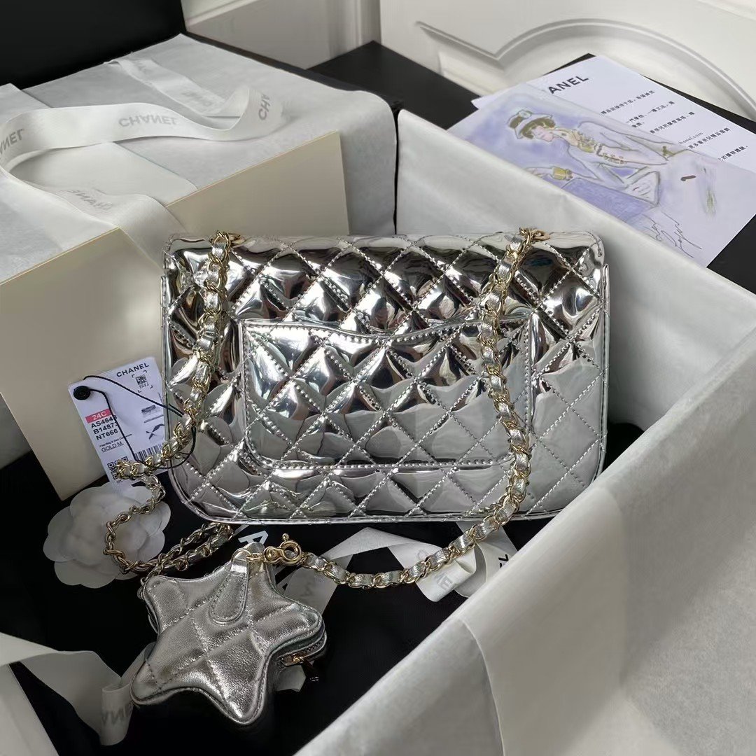 Cruise 2023/24 flap bag and star coin purse in mirrored calfskin, metallic calfskin and gold-tone metal.