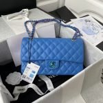 This medium classic double flap bag is crafted from blue lambskin with gradient metal hardware, front flap with signature CC turnlock closure, half-moon back pocket, adjustable gradient interwoven chain and blue leather shoulder strap.