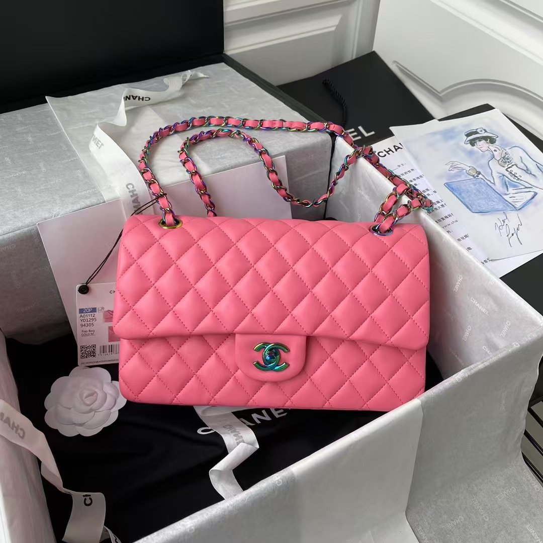 This medium classic double flap bag is crafted in dark pink lambskin leather with ombre metal hardware, front flap with signature CC turnlock closure, half-moon back pocket, adjustable interwoven ombre chain and dark pink leather shoulder strap.