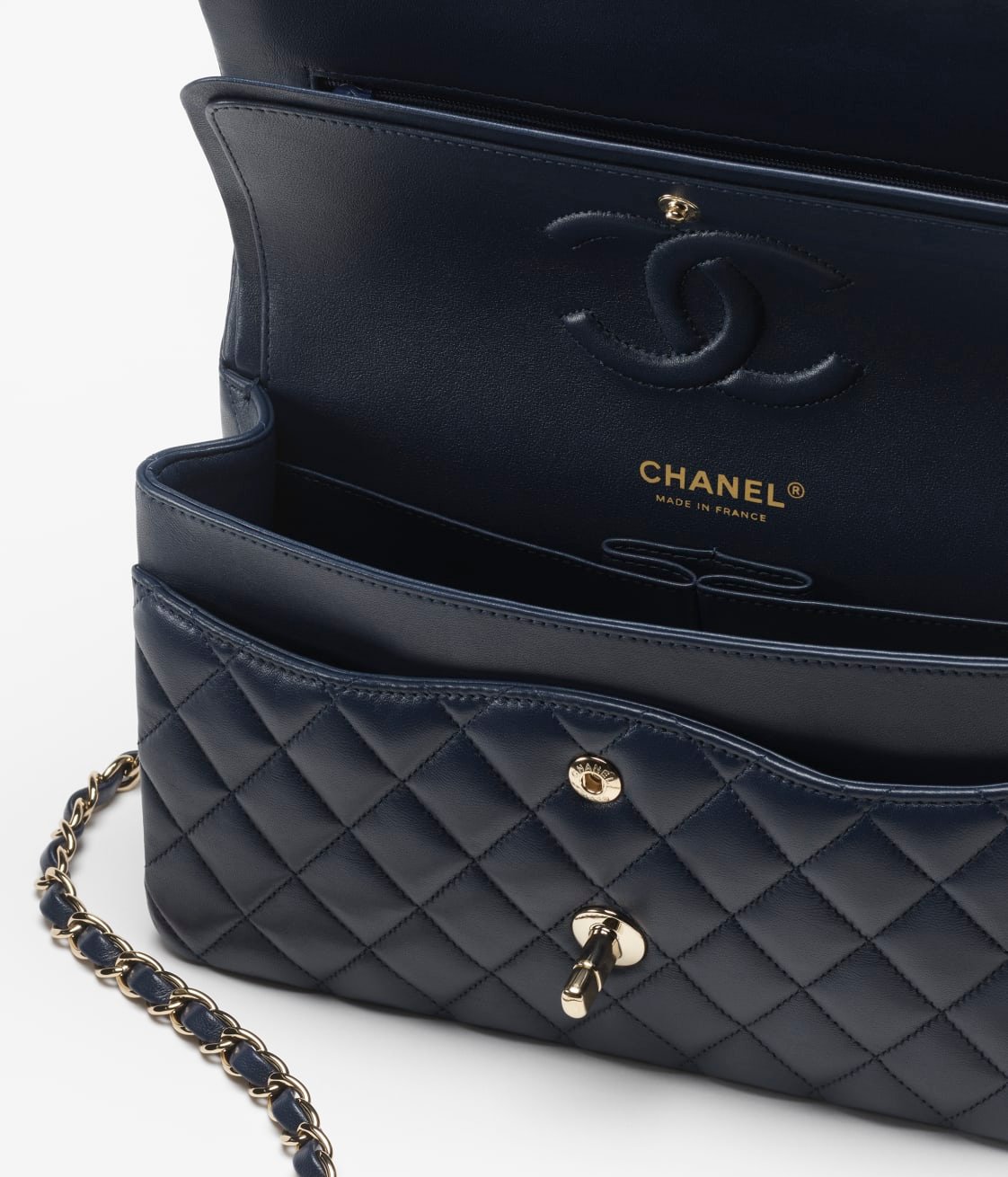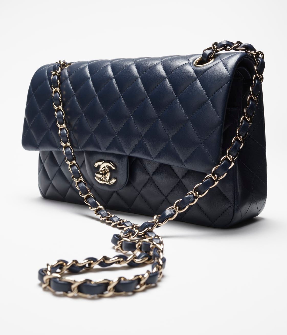 This flap bag is made of dark blue lambskin with gold hardware, front flap with signature CC turnlock closure, half-moon back pocket, adjustable gold interwoven chain link and dark blue leather shoulder strap.