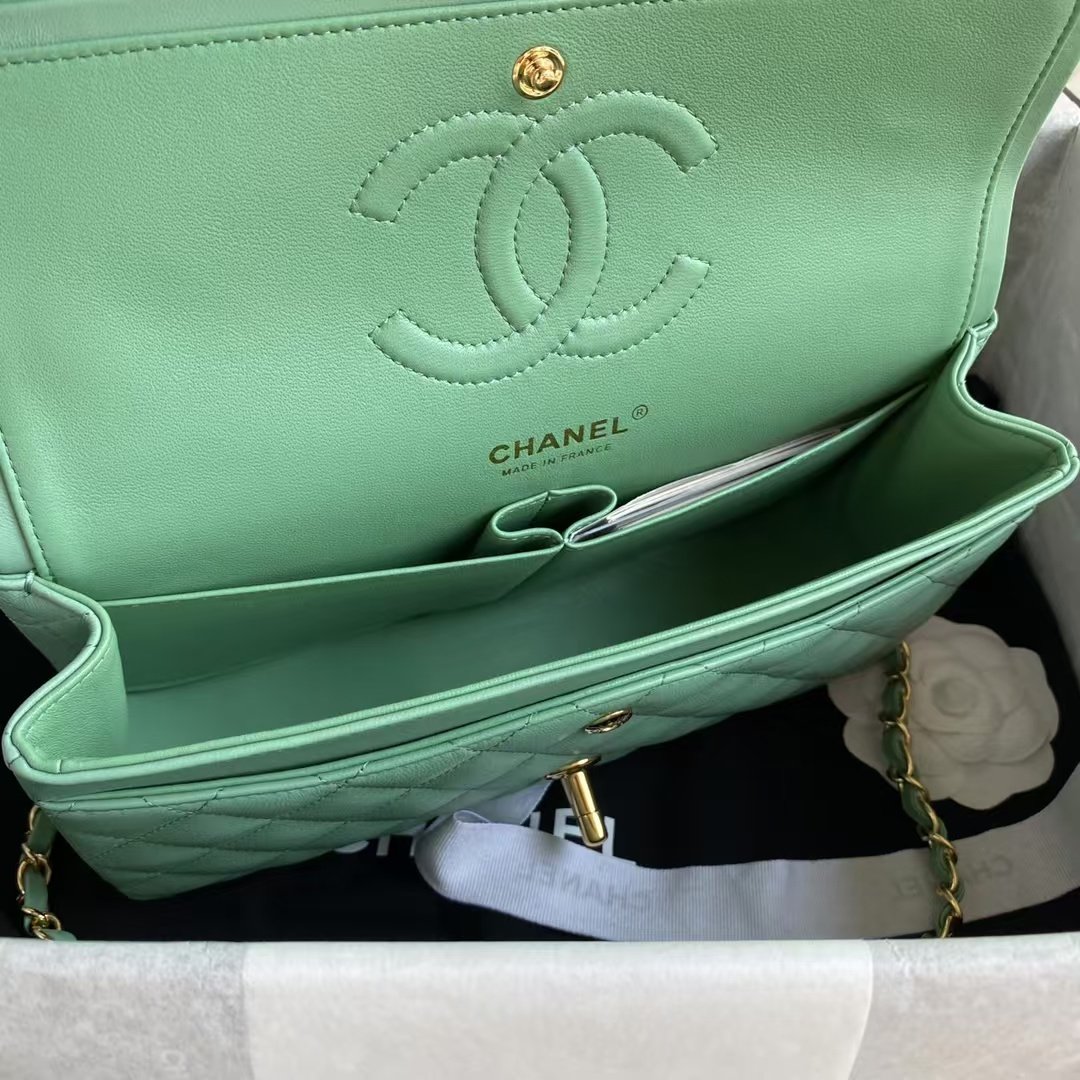 This medium classic double flap bag is crafted in green leather with light gold hardware, featuring the signature CC turnlock closure on the front flap, half-moon back pocket, adjustable interwoven light gold chain and green leather shoulder strap.