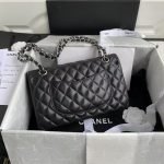 This medium classic double flap bag is crafted in black lambskin with silver-tone hardware, featuring the signature CC turnlock closure on the front flap, half-moon back pocket, adjustable interwoven silver-tone chain and black leather shoulder strap.