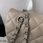This medium classic double flap bag is crafted in dark grey lambskin leather with silver hardware, featuring the signature CC turnlock closure on the front flap, half-moon back pocket, adjustable interwoven silver chain and dark grey leather shoulder strap.