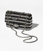 This flap bag is embellished with black and white crystals and features silver-tone hardware. It has a front flap with the signature CC turnlock closure, and an interwoven black leather and silver-tone chain link shoulder/crossbody strap.