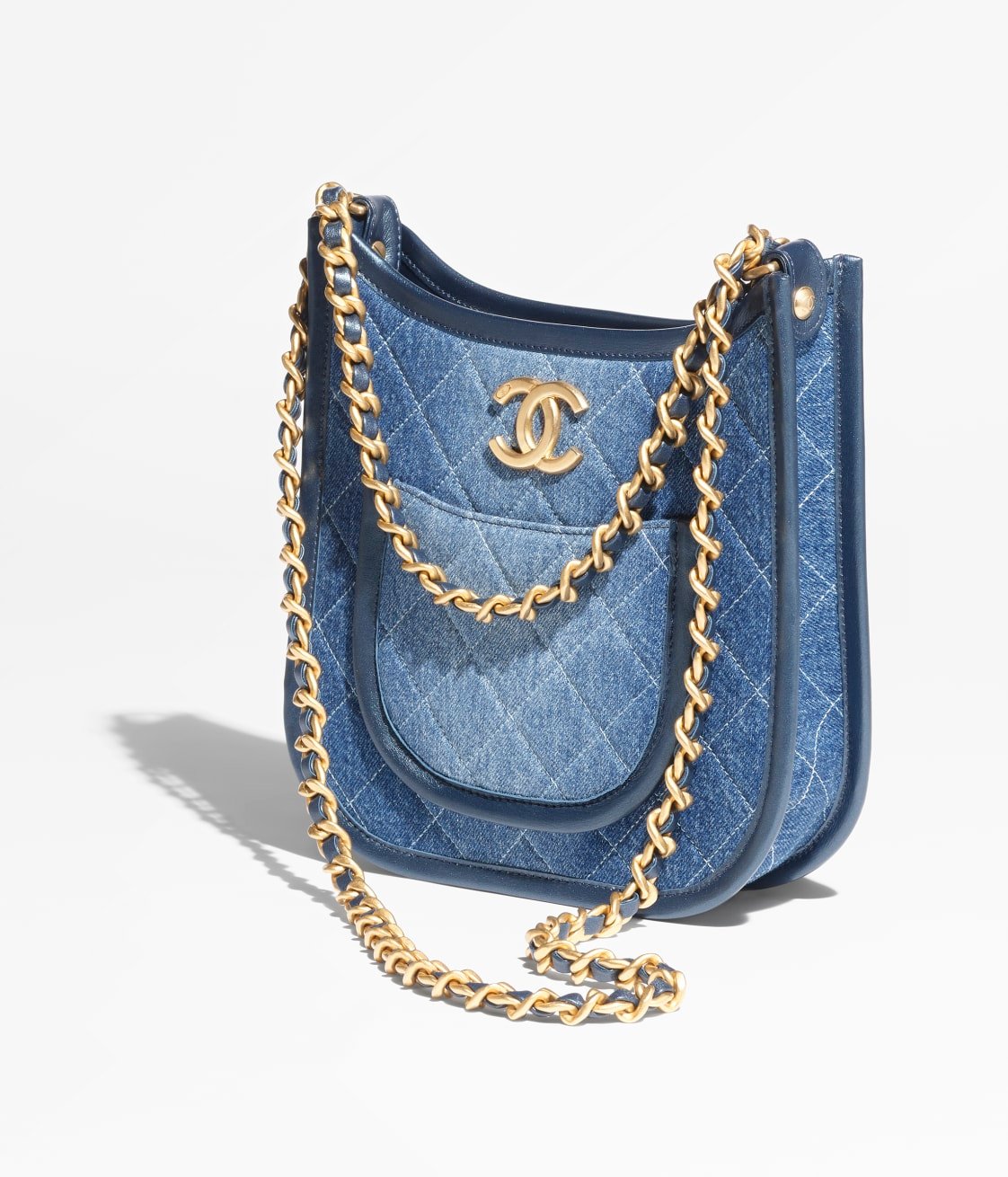 This Chanel HOBO bag is crafted in blue gradient denim with antique gold hardware, tonal stitching, front half-moon pocket with CC turnlock closure, and antique gold chain and leather shoulder/crossbody strap.