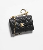 This Chanel Mini Square Pearl Flap Bag is crafted in black lambskin with brushed gold hardware, front flap with signature CC turnlock closure, tonal stitching, rear half-moon pocket, single interwoven black leather and brushed gold chain link shoulder/crossbody strap, and pearl and chain top handle strap.