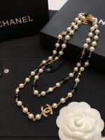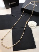 **Chanel Black & White Pearl Crystal Long Necklace with Line Brooch**