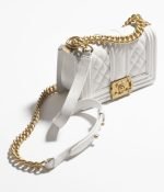This Chanel Small Boy Bag is in white lambskin with gold-tone hardware, tone-on-tone stitching, front flap with Le Vintage Boy CC push closure, smooth leather trim, antique gold-tone chain link and white leather shoulder strap.