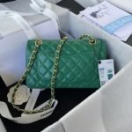 This Small Classic Double Flap bag is in Green lambskin leather with light gold tone hardware and features a front flap with signature CC turnlock closure, half moon back pocket, and adjustable interwoven light gold tone chain link and green leather shoulder strap.