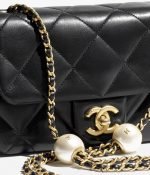 This Chanel Square Double Bead Flap Bag is crafted in black lambskin with brushed gold hardware, front flap with signature CC turnlock closure, tonal stitching, single interwoven black leather and brushed gold chain link pearl shoulder/crossbody strap.