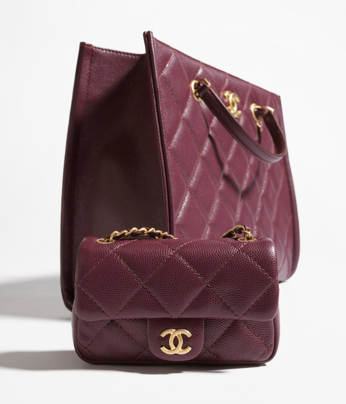 This vintage flap bag is crafted in burgundy grained calfskin with gold hardware, CC turnlock closure on the front, interwoven gold-plated chain links and burgundy leather shoulder/crossbody strap.