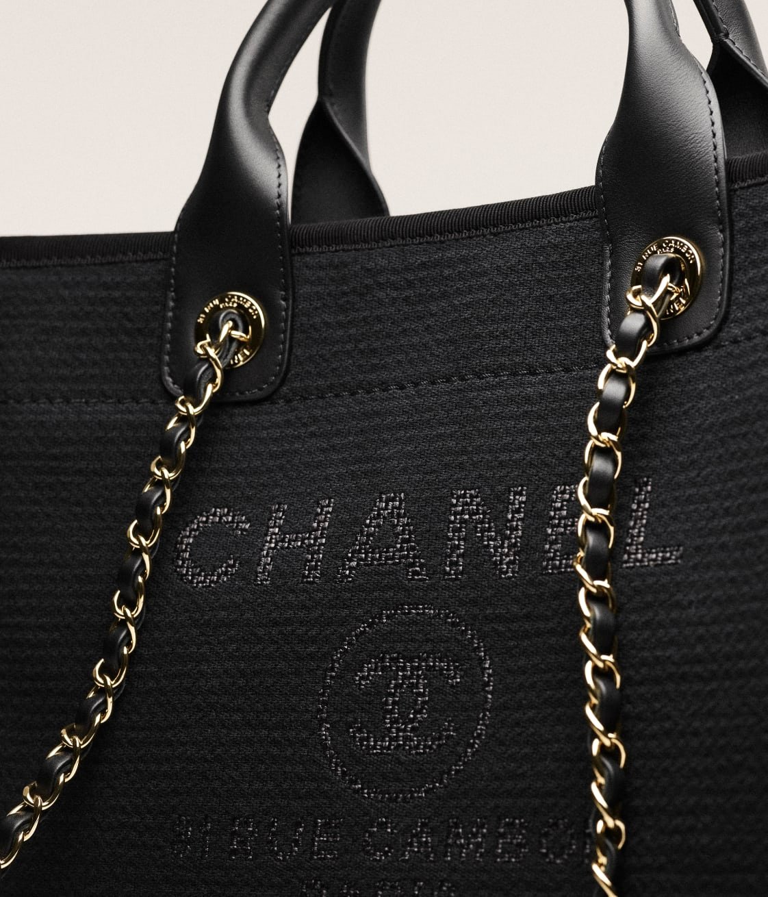 This Small Deauville bag is made of black canvas fabric with light gold tone hardware has a large CC signature and Chanel logo on the front, removable pouch and interwoven light gold tone chain link and black leather shoulder straps.