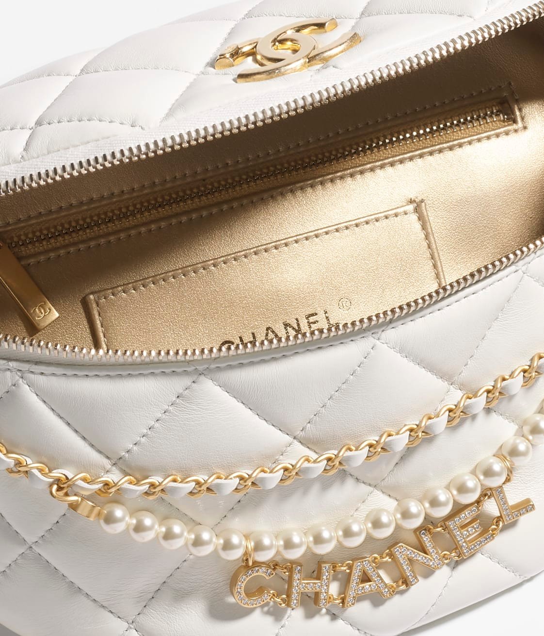 This small waist bag is made of white lambskin, imitation pearls and light gold hardware, with tonal stitching, imitation pearls and light gold hardware CC on the front, zip closure, zip pocket on the waist bag, light gold and metal interweaving, white leather chain link belt/crossbody strap.