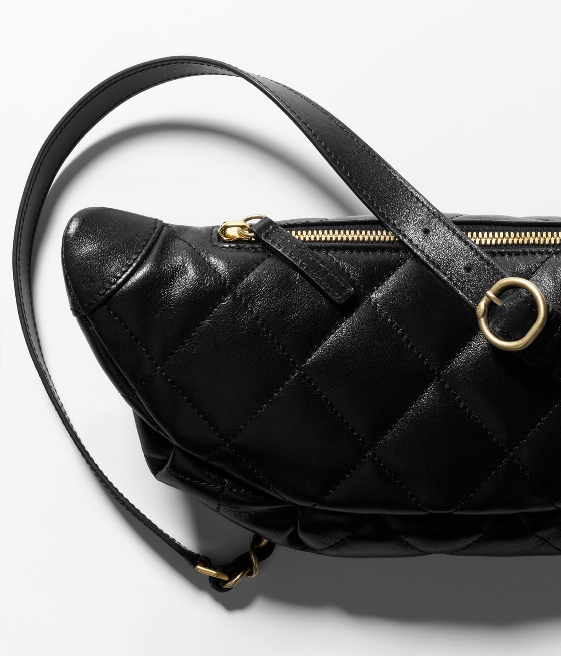 This black shiny calfskin belt bag with light gold hardware features tonal stitching and light gold hardware on the front, two small front pockets with magnetic closures, gold metal CC logo, zip pocket on the belt bag, light gold and metal interweaving, black leather chain link belt/crossbody strap.
