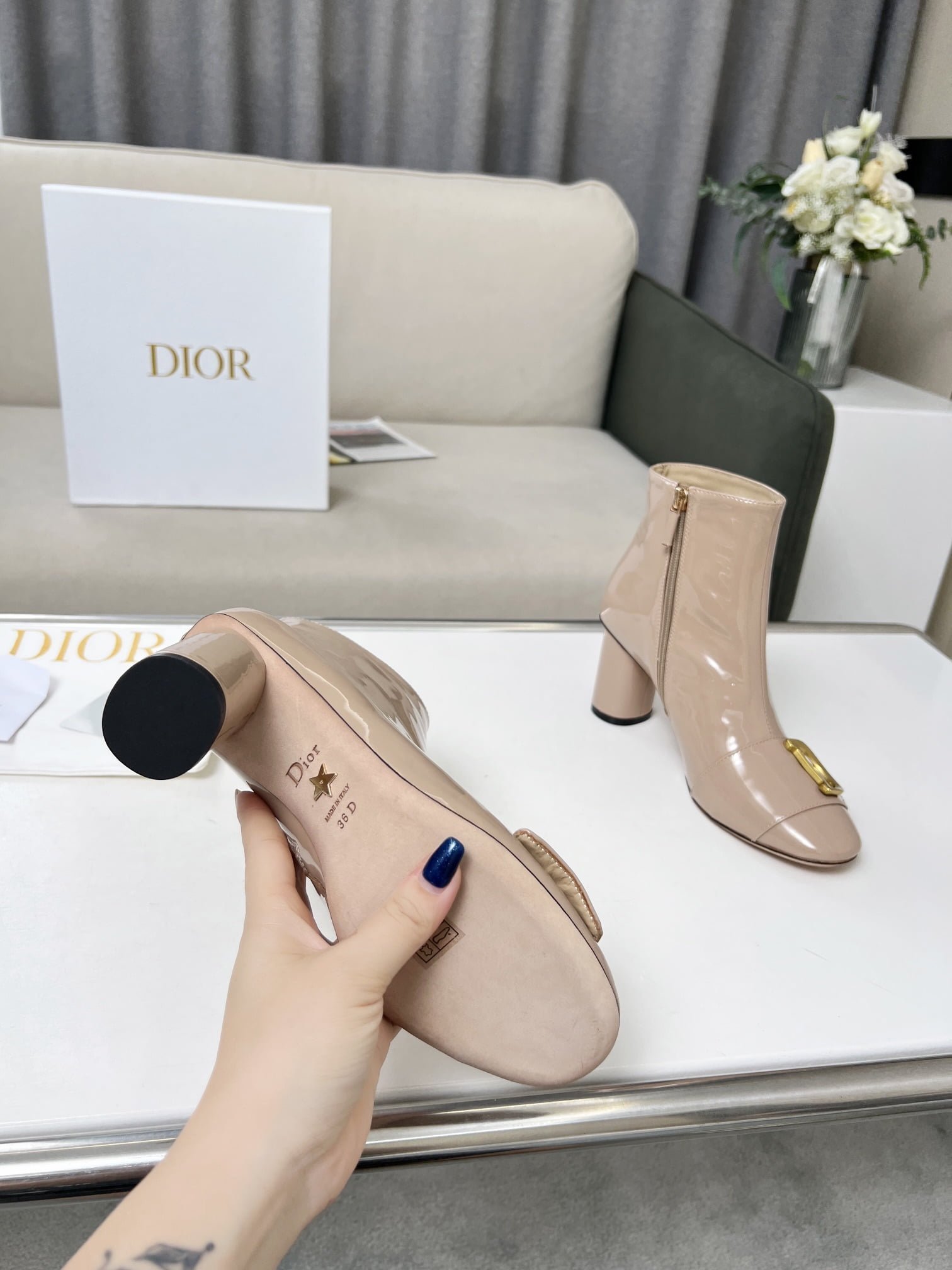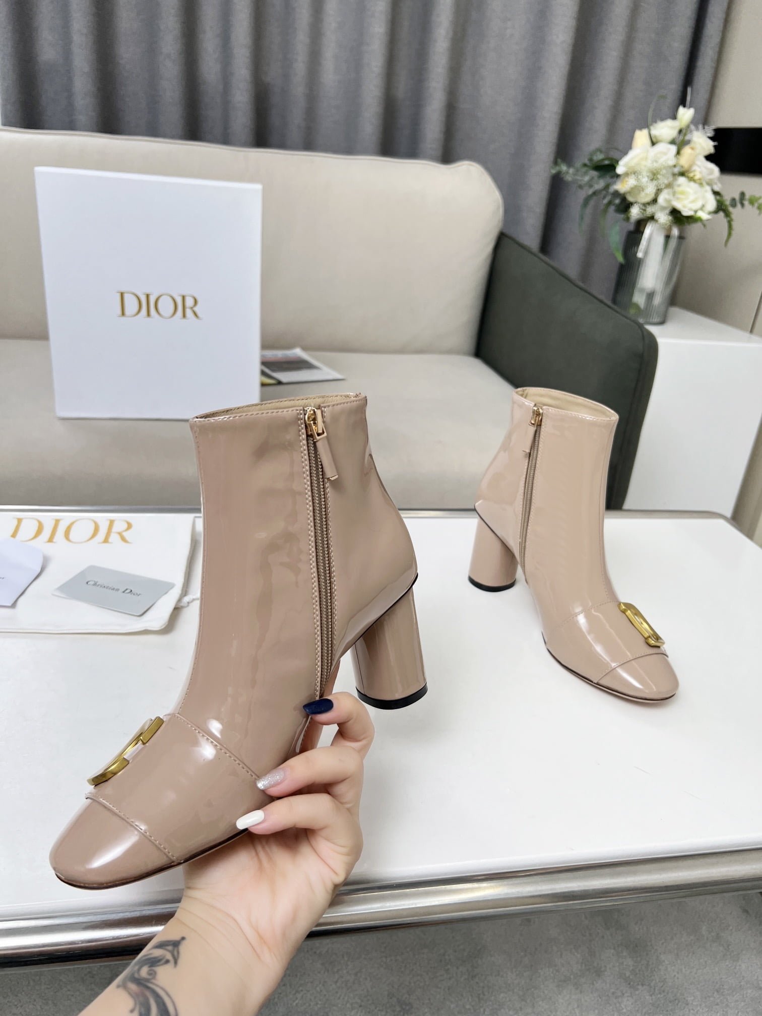 Dior 2023 autumn and winter new nude boots. the outside of the upper whole piece of soft patent leather constantly open. simple atmosphere. 🌹🌹🌹 with brand classic vintage hardware buckle. Patent leather mirror upper with 7.5cm heel height. ultra leg length. Can let you second change no problem temperament goddess 👄💗👄 Yang Jing color later