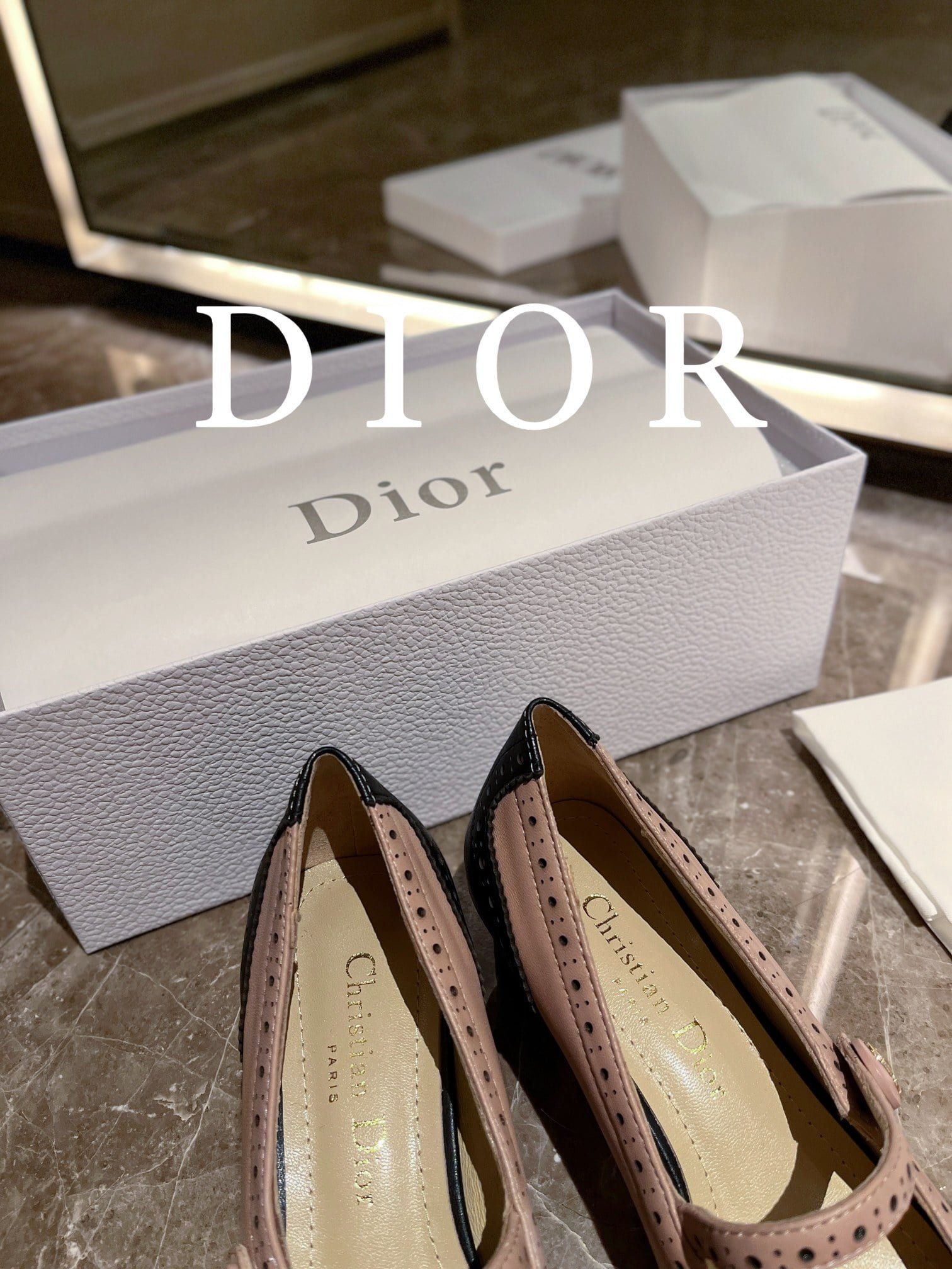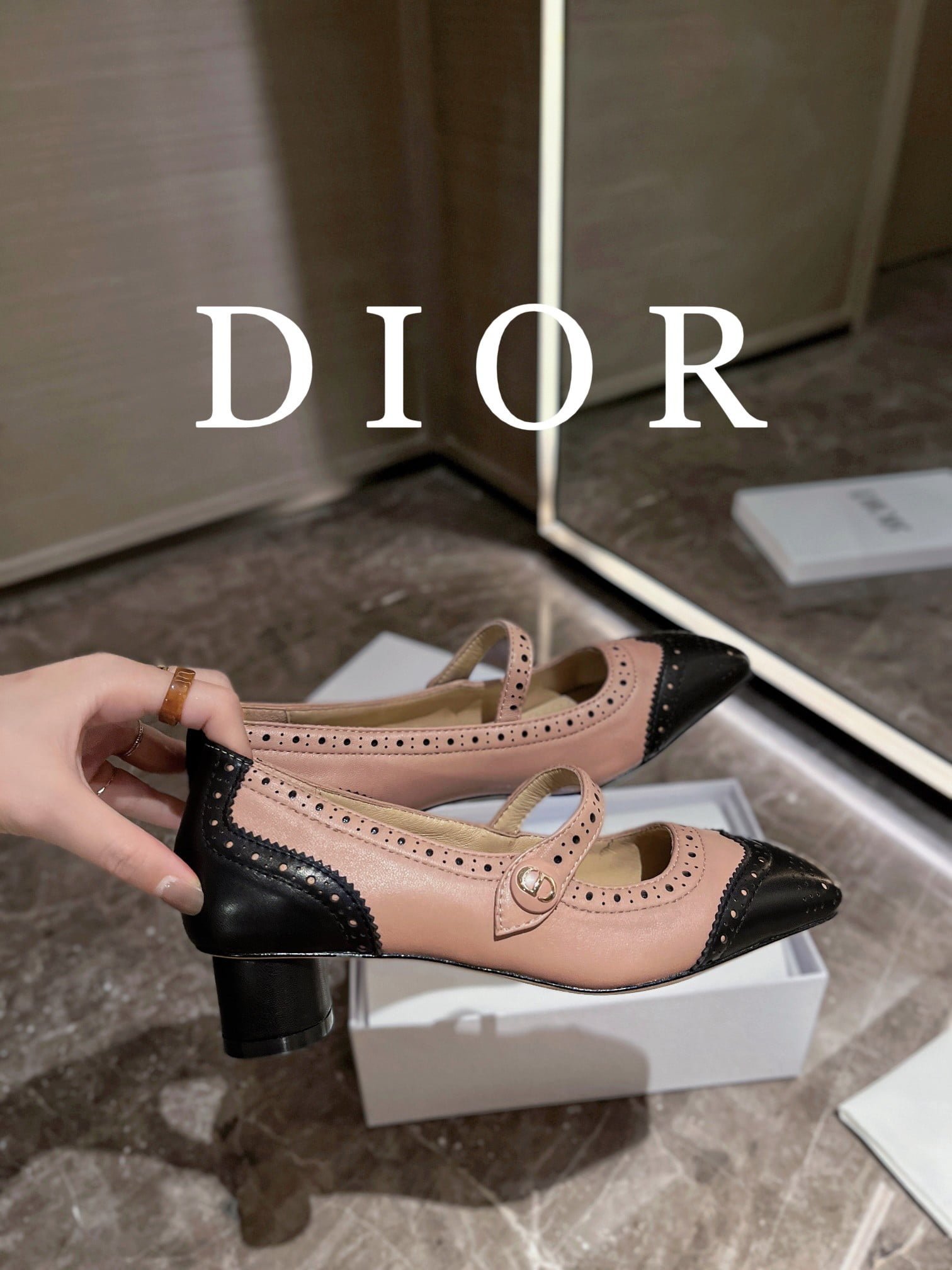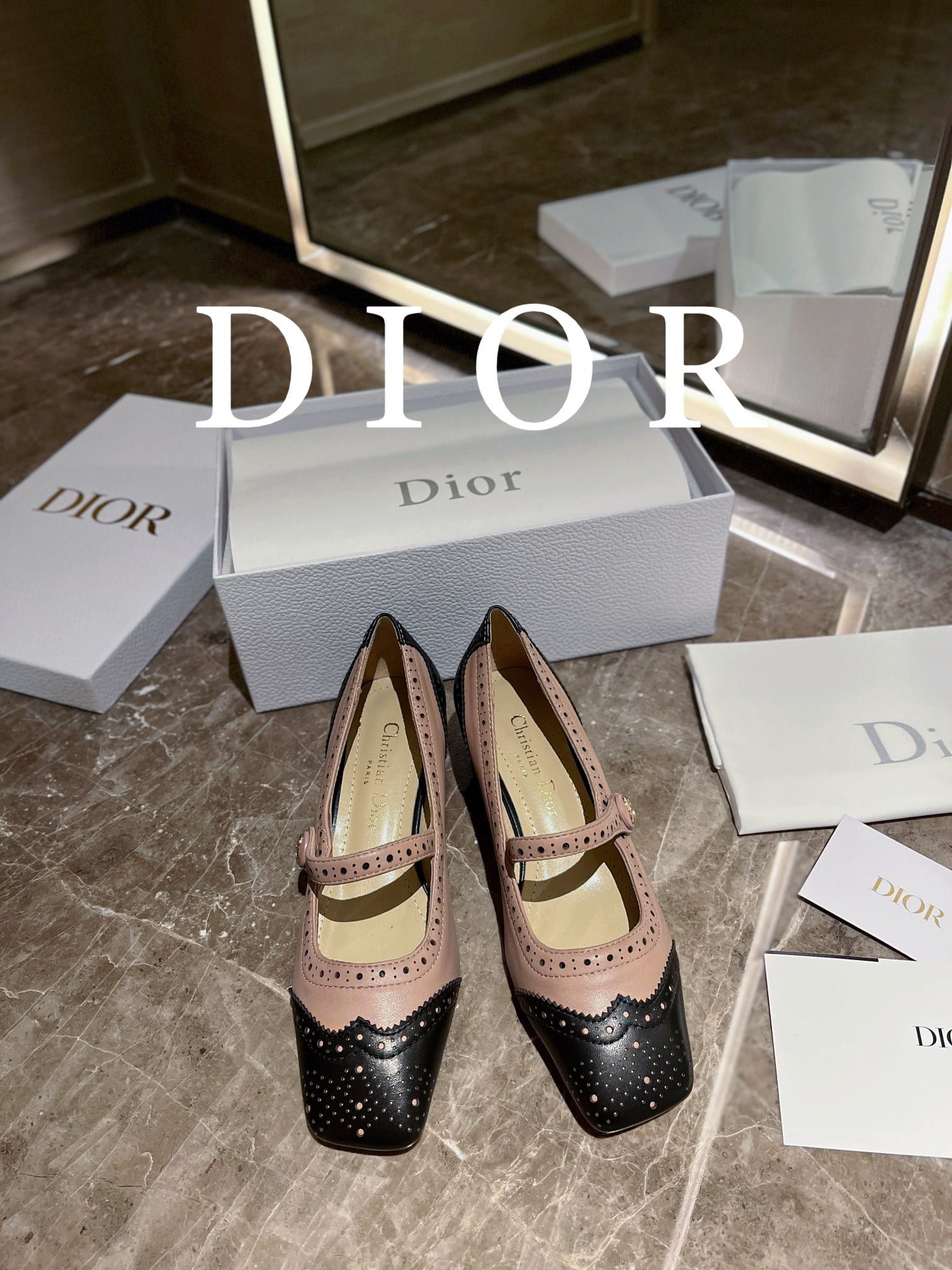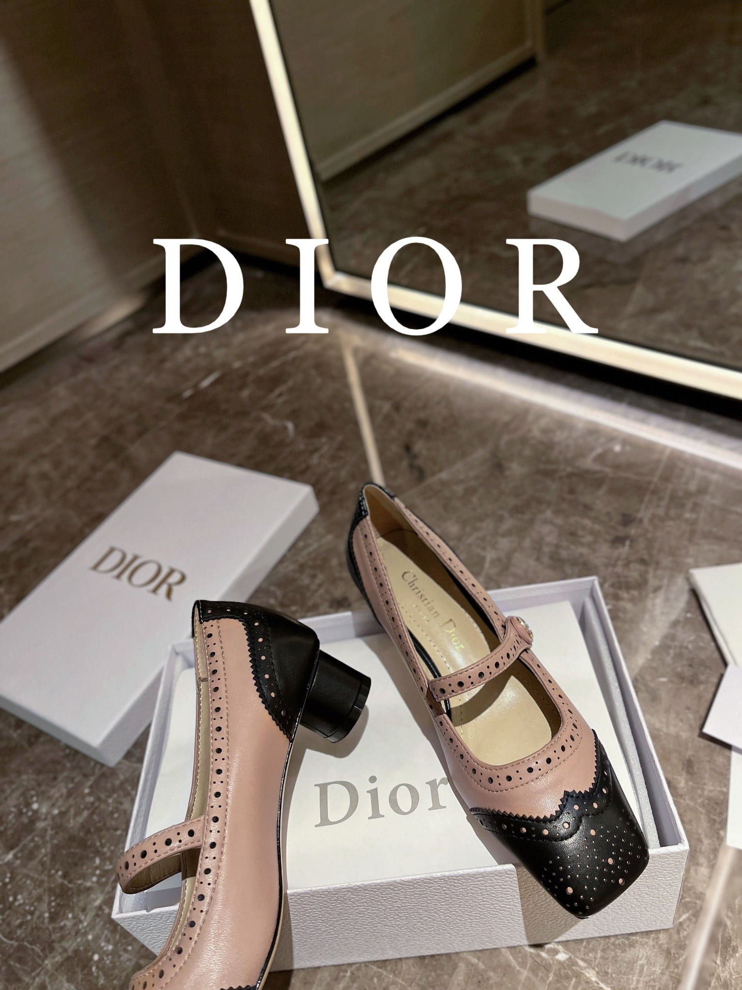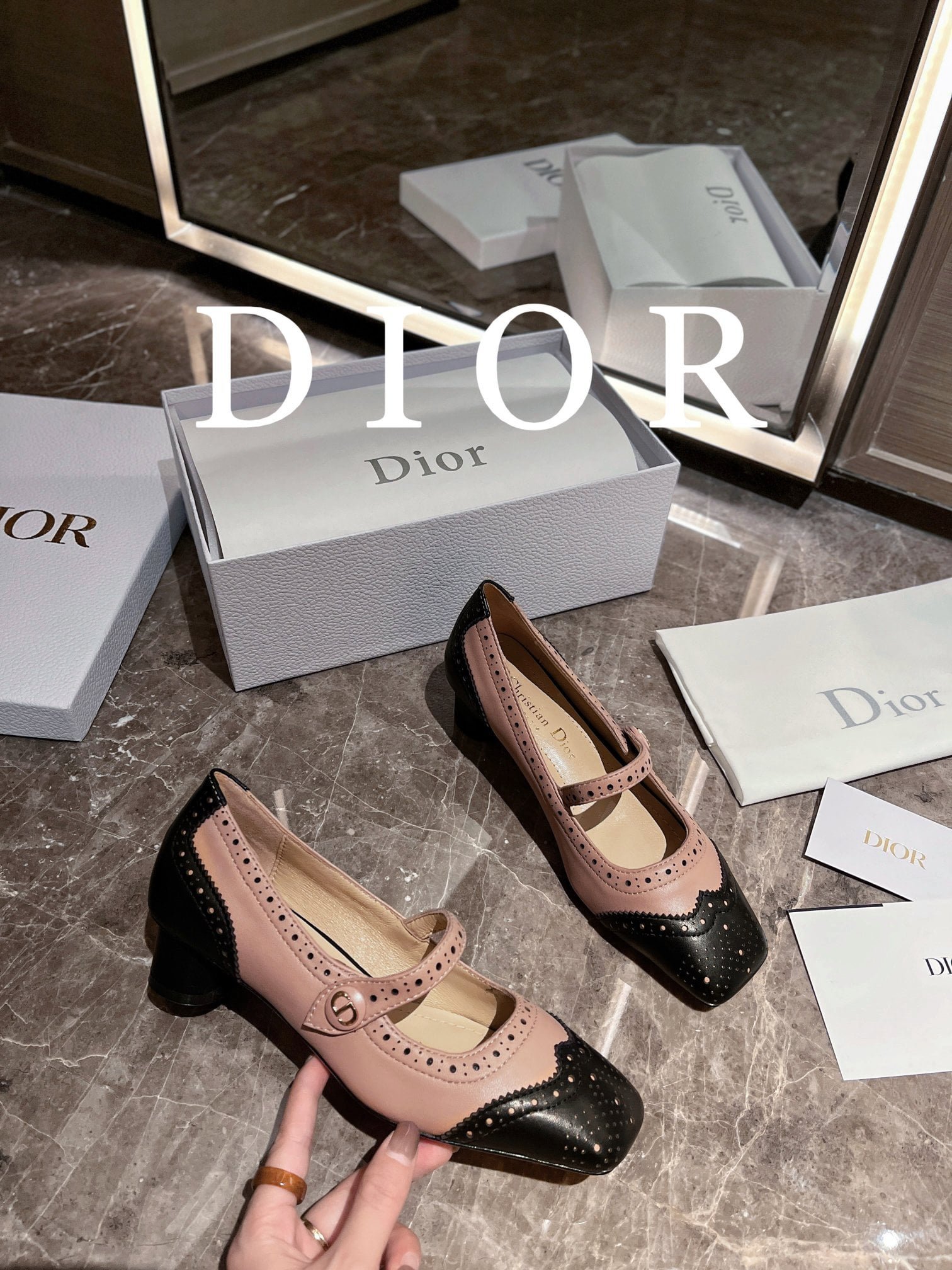 These Spectadior ballet heels were presented at the launch show. reinterpreting the classic Mary Jane shoes and highlighting the elegant and stylish style. Two-toned black and white ox-leather uppers with decorative perforated details. paired with a sash adorned with a gold-finished CD logo. The elegant square toe and 3.5cm cylindrical heel are refined and can be paired with the gaiters of the collection for equestrian elegance.