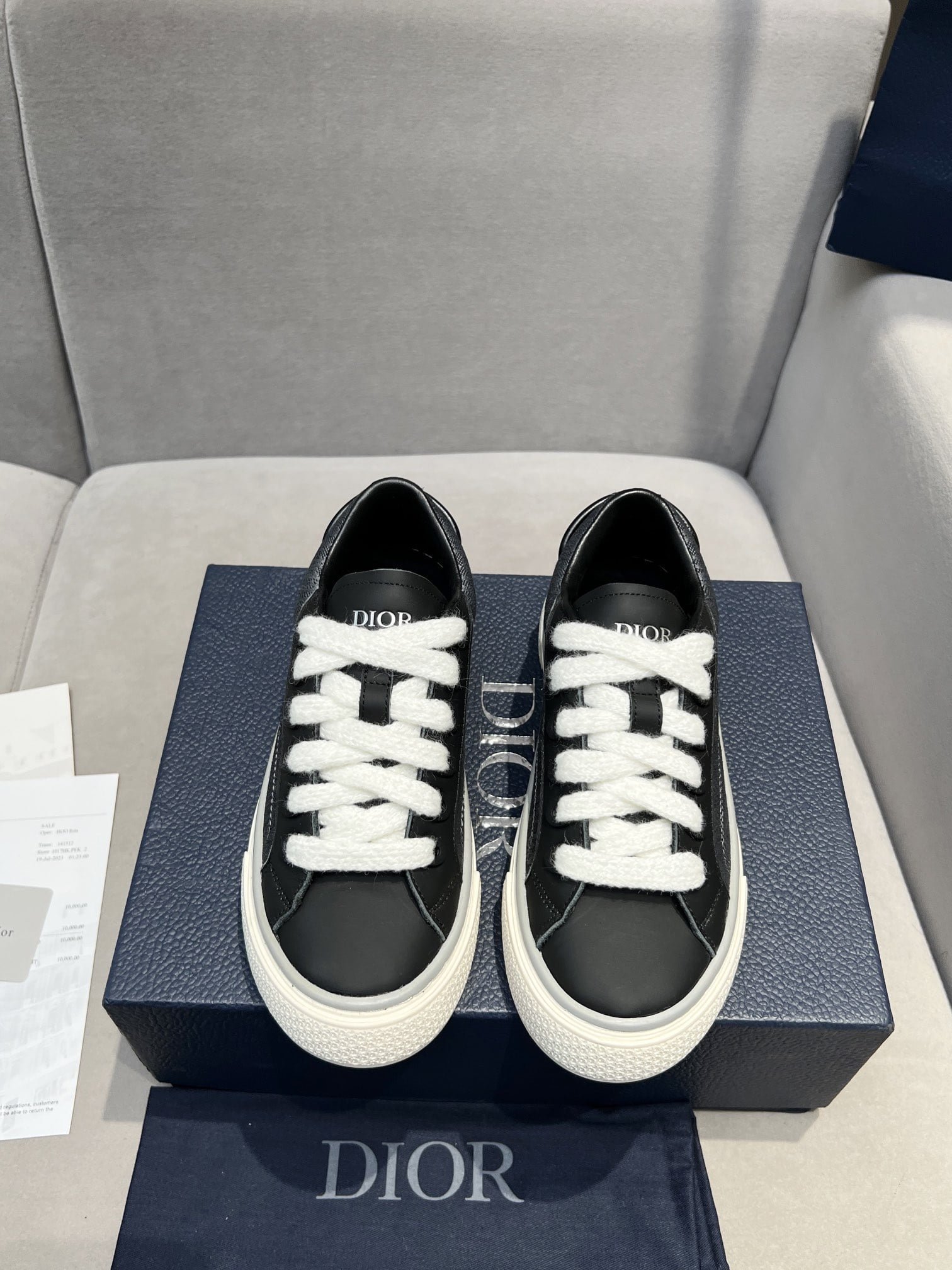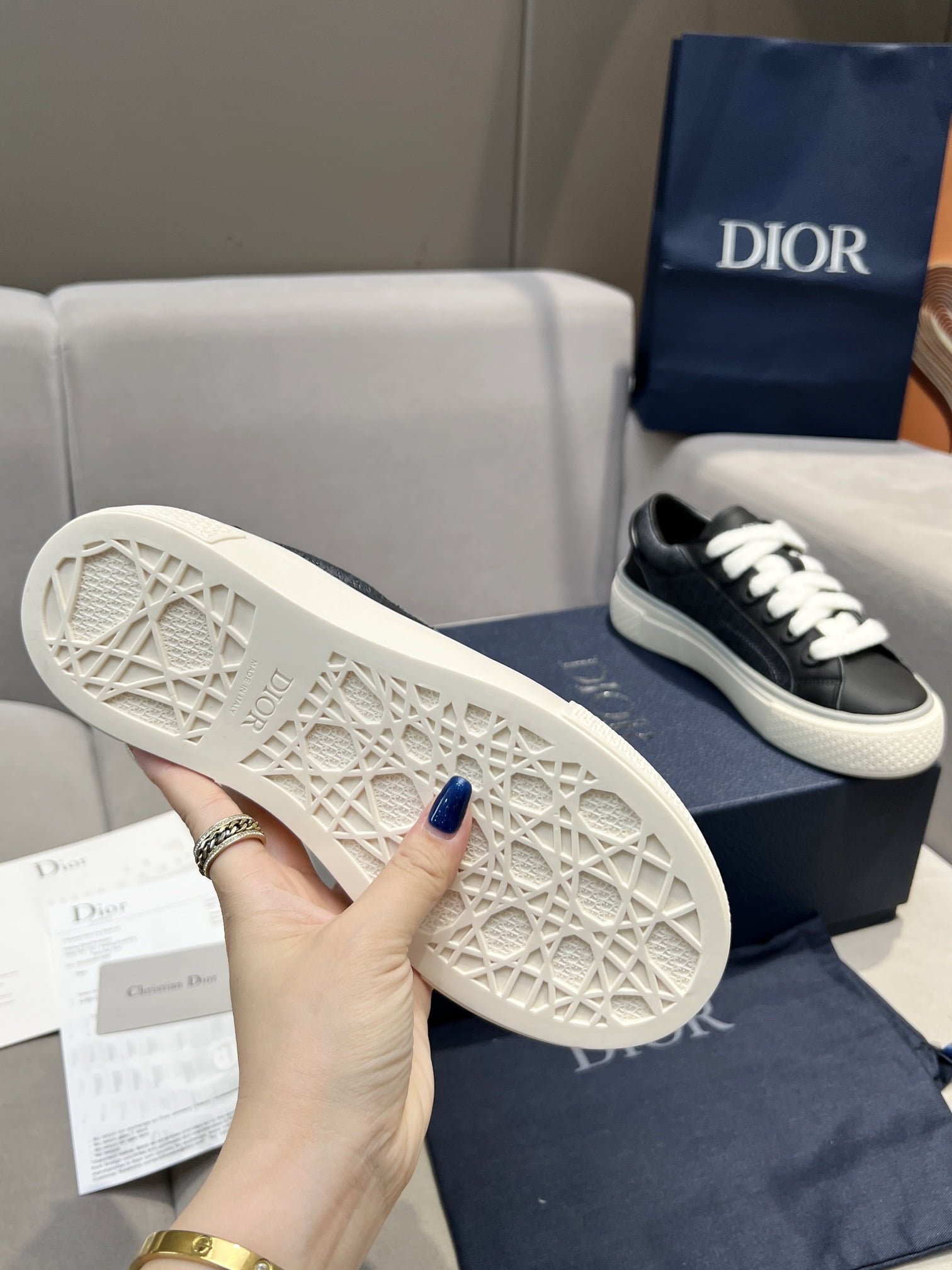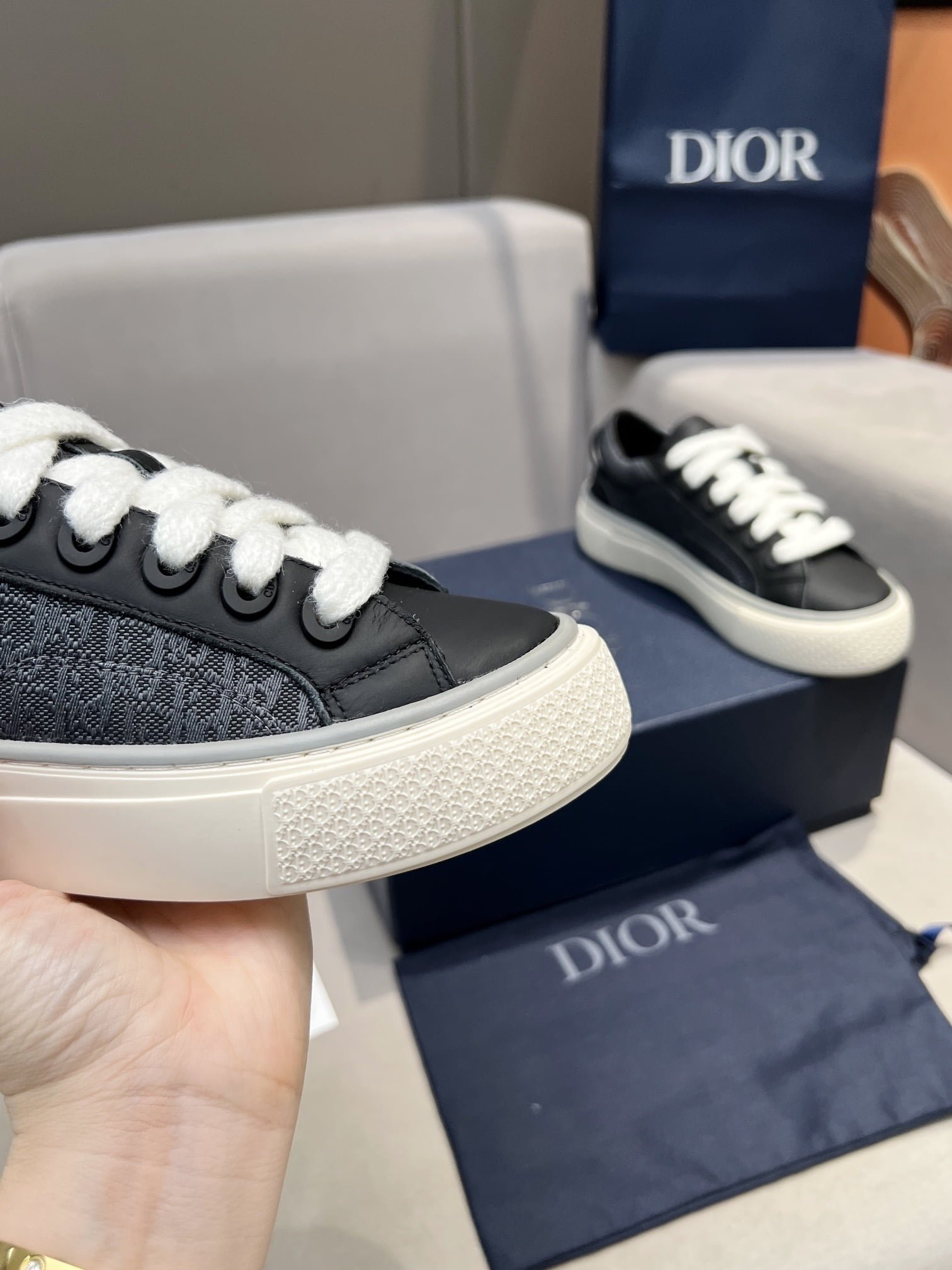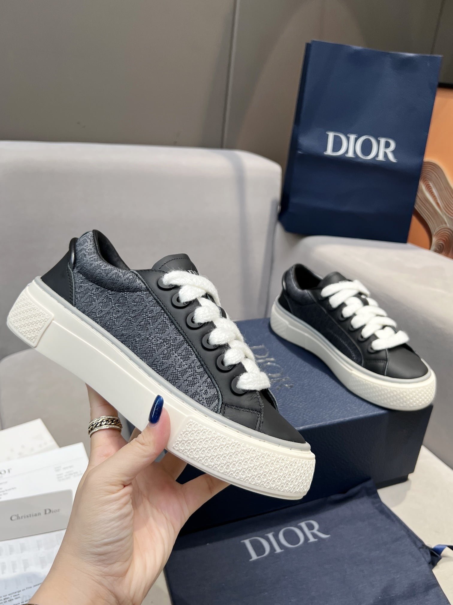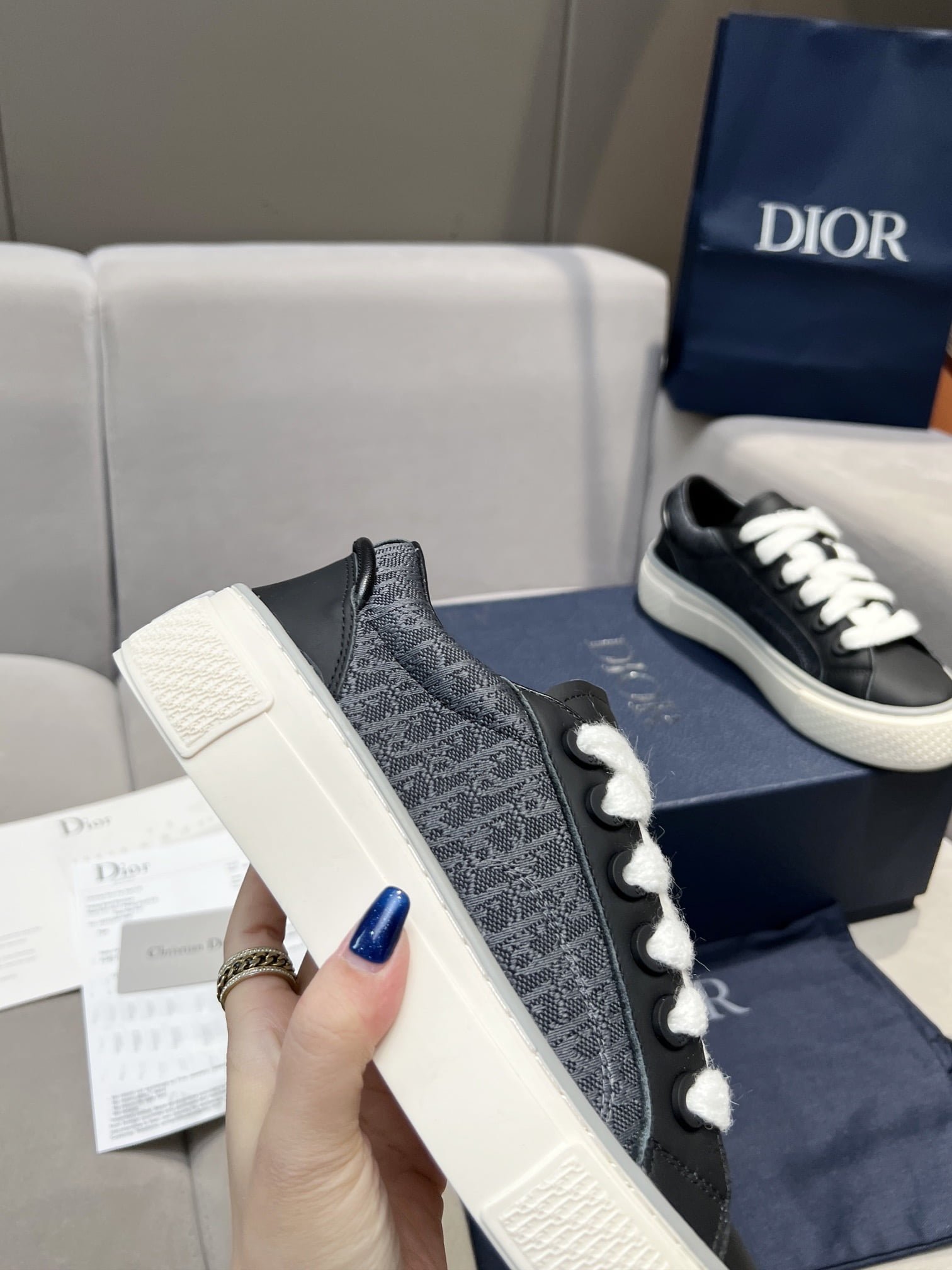 This B33 sneaker is a new product for Fall 2013. reinterpreting the classic tennis shoes. and the stylish silhouette highlights the thick feeling. Crafted in navy blue and white jacquard fabrics with Oblique printing and suede inserts. the distinctive cushioned tongue is embellished with Dior embossed logo. with navy mohair wide LACES and matte toned brass perforations. The white Dior Oblique patterned rubber soles are enhanced by the contrasting Dior 30 Avenue Montaigne logo on the back. Can add fashionable temperament to casual style