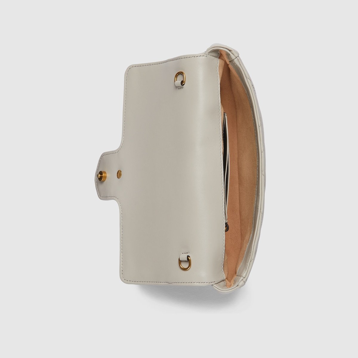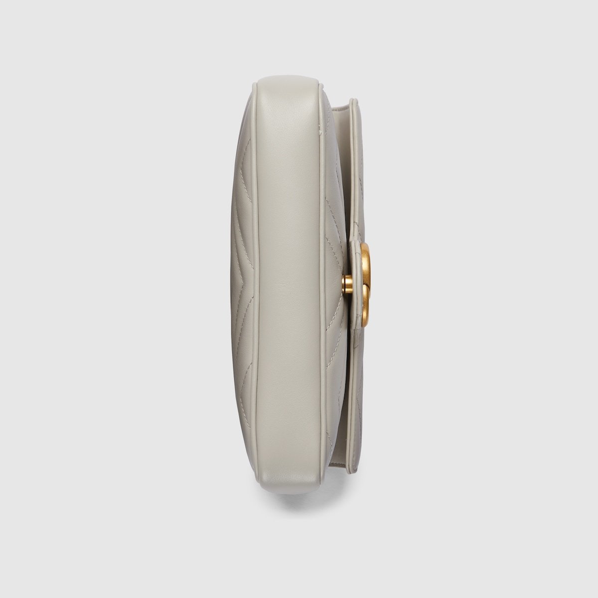 This GG Marmont mini bag is crafted from a light grey matelassé chevron leather. The signature Double G hardware in antique gold-toned defines the accessory, while a detachable leather card case completes the style.