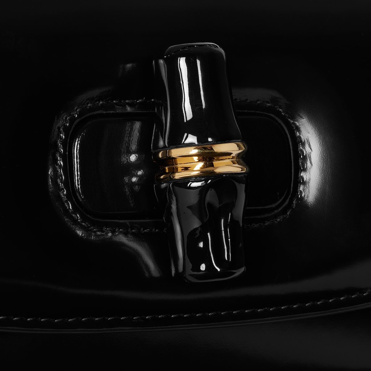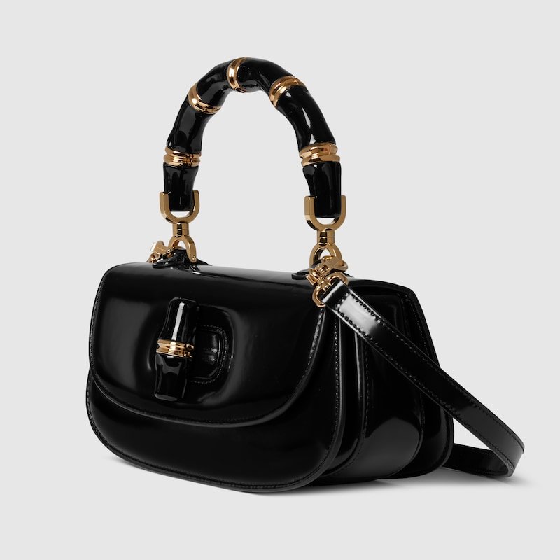 In the Spring Summer 2025 collection, this small top handle bag reinterprets the signature bamboo hardware with enamel and brass details. Gucci Bamboo Diva is the starring feature for any look.