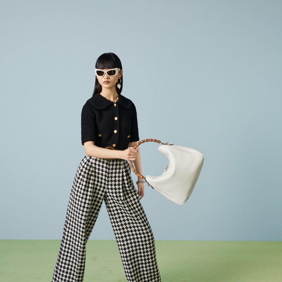 Combining recognizable elements of the House, the medium-sized shoulder bag is defined by its bamboo handles and Double G hardware. Crafted from white leather, the accessory is further accentuated a contrasting red leather shoulder strap.
