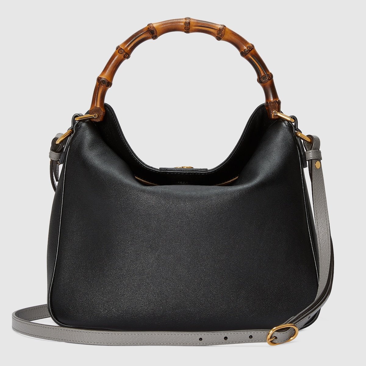 Combining recognizable elements of the House, the small shoulder bag is defined by its bamboo handles and Double G hardware. Crafted from black leather, the accessory is further accentuated a contrasting leather shoulder strap in grey.