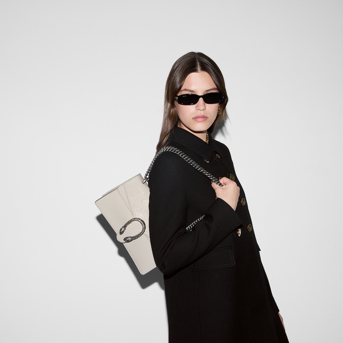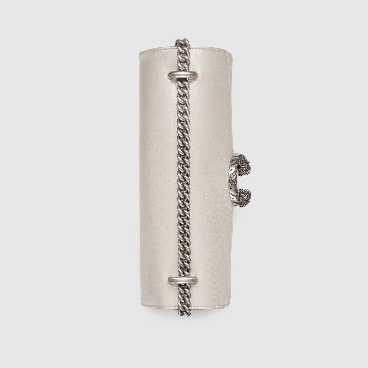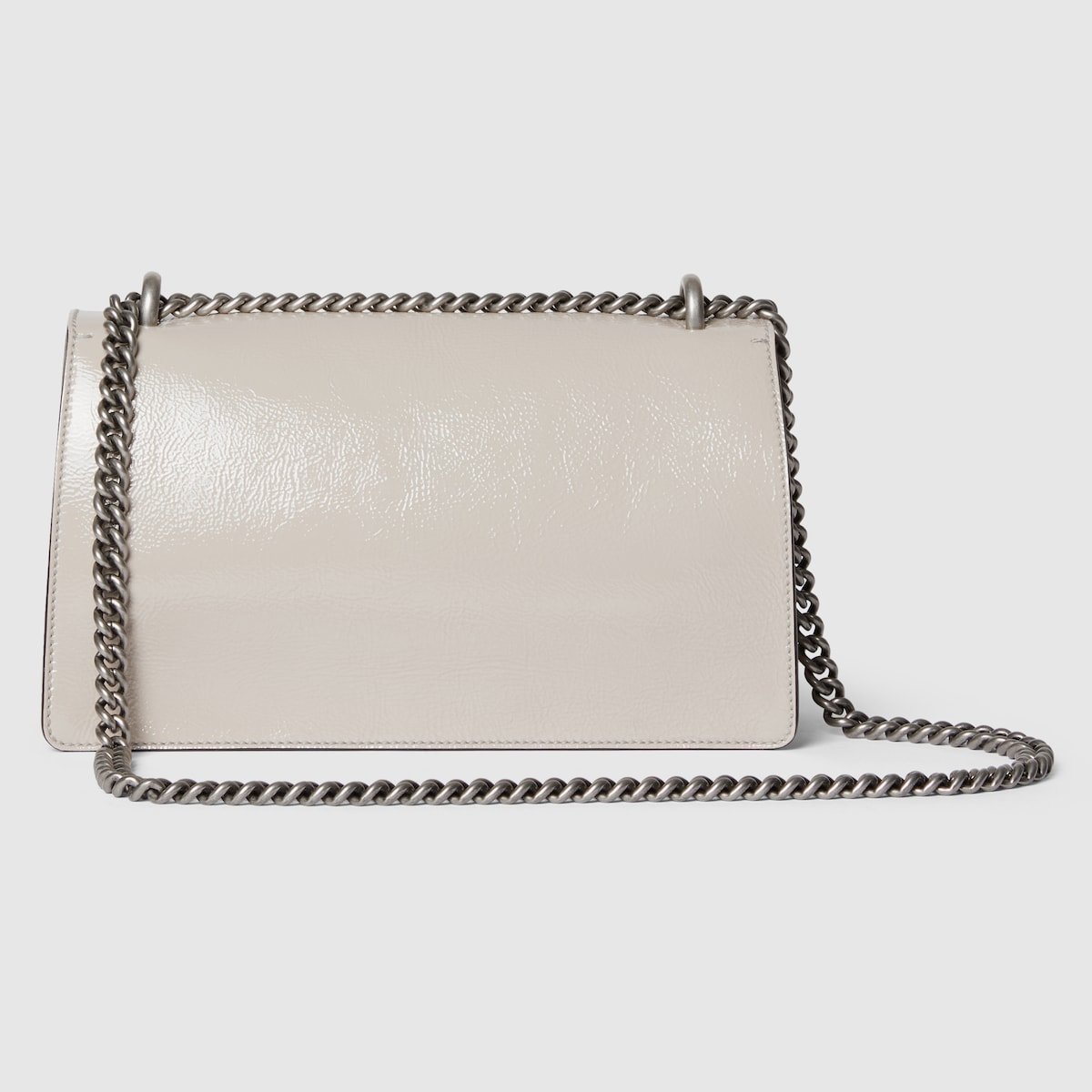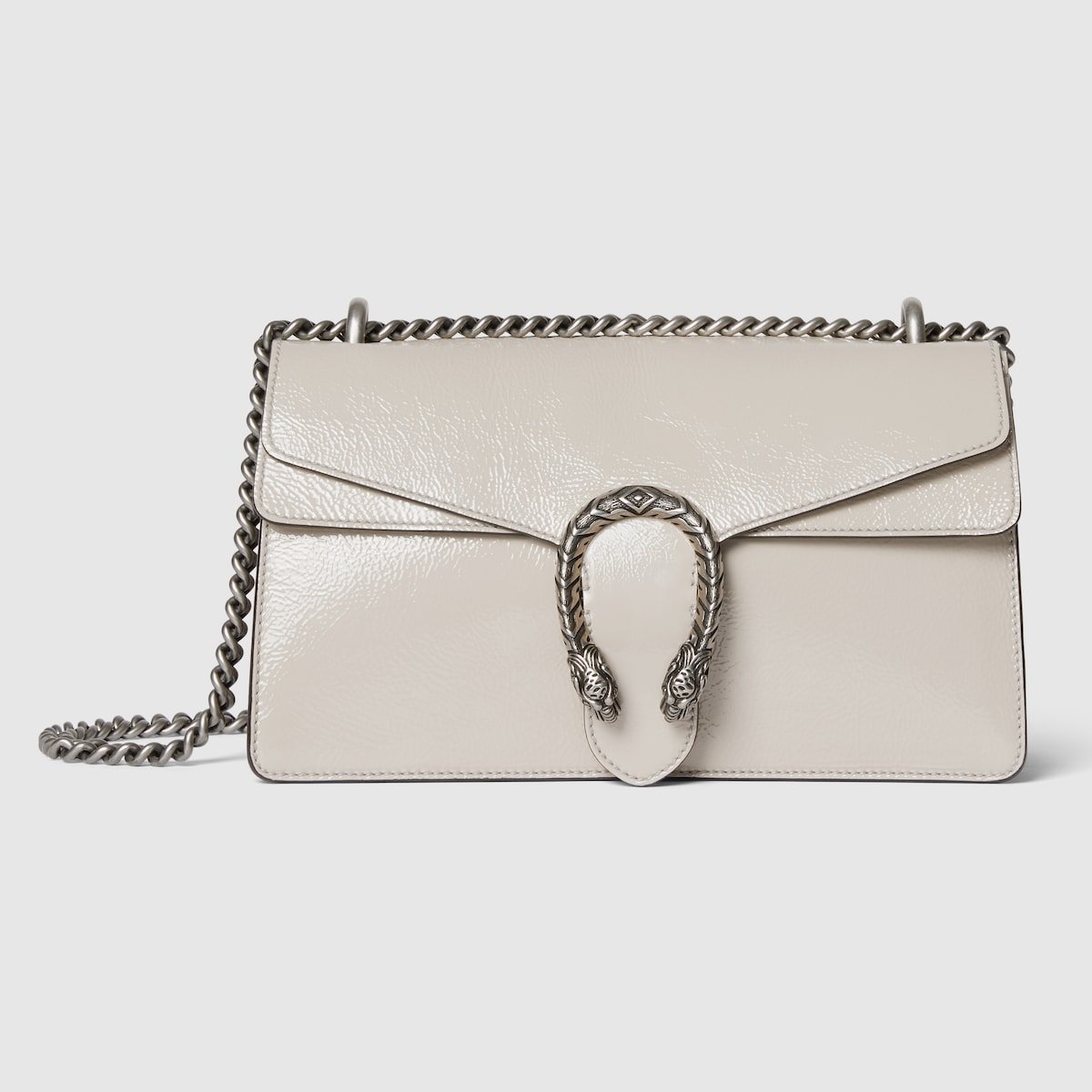 A soft, deconstructed version of the signature Dionysus shoulder bag presents a contemporary look. This style in sleek light grey patent leather features the iconic tiger head closure with a flap and a sliding chain that can be worn both as a shoulder bag and a top handle bag, giving it many possibilities to wear.