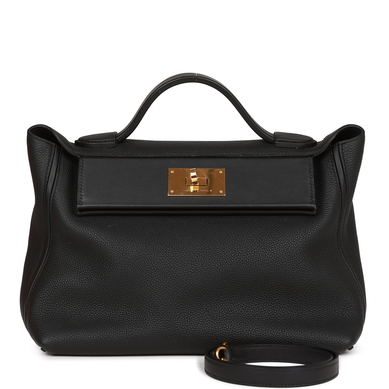 This 24/24 bag is in Black swift and togo leather with gold hardware and has tonal stitching. front turnlock closure. open rear pocket. single flap top handle and removable shoulder strap.The interior is lined with black swift leather and has one zip pocket with an Hermes engraved pull on the back wall.Collection: Y