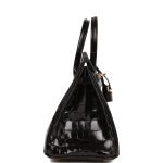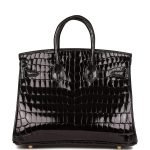 This Birkin is in Black shiny Niloticus crocodile leather with gold hardware and has tonal stitching. front strap. two straps with center toggle closure. clochette with lock and two keys and double rolled handles.The interior is lined with Black chevre and has one zip pocket with an Hermes engraved zipper pull and an open pocket on the opposite side.Collection: UOrigin: FranceCondition: Pristine; new or never worn (Plastic on hardware)Accompanied by: Hermes box. Hermes dustbag. clochette. lock. two keys. clochette dustbag. rainhat. care booklet. CITES and feltMeasurements: 10 width x 7.5 height x 4.75 depth; 2.75 handle drop