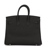 This Birkin is in Black togo leather with palladium hardware and has tonal stitching.front flap. two straps with center toggle closure. clochette with lock and two keys. and double rolled handles.The interior is lined with black chevre and has a zip pocket with an Hermes engraved zipper pull and an open pocket on the opposite side.Collection: UOrigin: FranceCondition: Pristine; new or never worn (Plastic on hardware)Accompanied by: Hermes box. Hermes dustbag. clochette. lock. two keys. clochette dustbag. rainhat. carebook and feltMeasurements: 10 width x 7.5 height x 4.75 depth; 2.75 handle drop