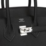 This Sellier Birkin is in black epsom leather with palladium hardware and has tonal stitching.front flap. two straps with center toggle closure. clochette with lock and two keys. and double rolled handles.The interior is lined with black chevre and has one zip pocket with an Hermes engraved zipper pull and an open pocket on the opposite side.Collection: UOrigin: FranceCondition: Pristine; new or never worn (Plastic on hardware)Accompanied by: Hermes box. Hermes dustbag. clochette. lock. two keys. clochette dustbag. felt. rainhat. carebook and ribbonMeasurements: 10 width x 7.5 height x 4.75 depth; 2.75 handle drop
