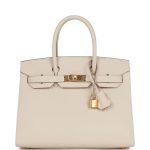 This Sellier Birkin is in Craie epsom leather with gold hardware and has tonal stitching.front flap. two straps with center toggle closure. clochette with lock and two keys. and double rolled handles.