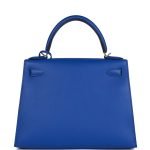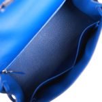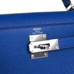 This Kelly Sellier is of Bleu Royal epsom leather with palladium hardware and has tonal stitching. a front toggle closure. a clochette with lock and two keys. a single rolled handle and an optional shoulder strap.The interior is lined with Bleu Royal chevre leather and has one zip pocket with an Hermes engraved pull and two open pockets on the opposite side.Collection: UOrigin: FranceCondition: Pristine; new or never worn (plastic on hardware)Accompanied by: Hermes box. Hermes dustbag. clochette. lock. two keys. shoulder strap. clochette dustbag. shoulder strap dustbag. felt. rainhat. and ribbonMeasurements: 11.25 width x 8.25 height x 4.75 depth; 3.5 handle drop (16.5 shoulder strap drop)