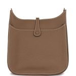 This Evelyne is in Etoupe clemence leather with gold hardware and has contrast stitching. pull tab top closure and Etoupe removable canvas and leather shoulder/crossbody strap.The interior is lined with natural leather.Collection: UOrigin: FranceCondition: Pristine; new or never wornAccompanied by: Hermes box. Hermes dustbag. shoulder strap. shoulder strap dustbag and carebookMeasurements: 11.5 width x 12 height x 3 depth; 18.5 strap drop