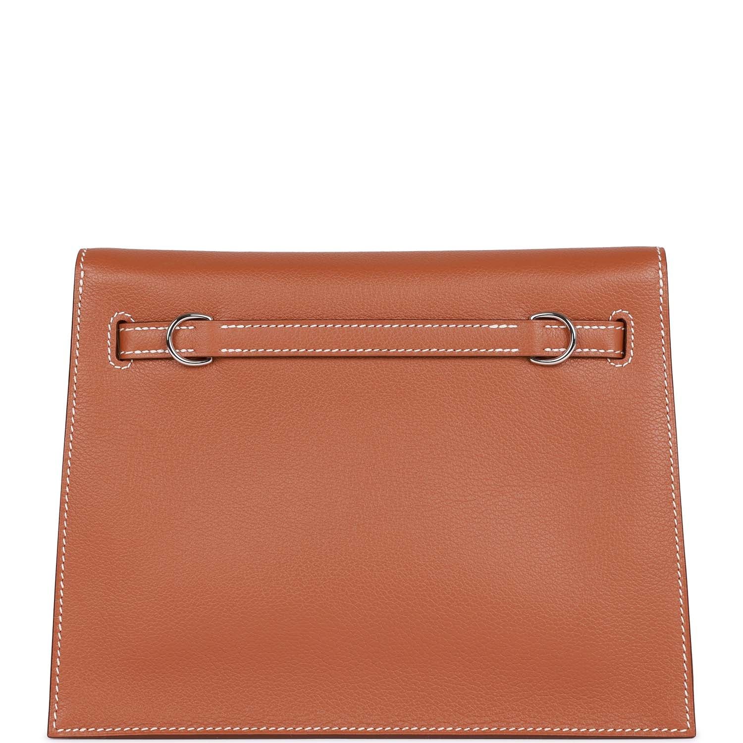 This Kelly Danse II is in Gold evercolor leather with palladium hardware and has contrast stitching. two straps with front flap closure and an adjustable flat crossbody/backpack/belt strap.The interior is lined with Gold lambskin and has a removable Hermes stamped base and an open wall pocket.Collection: UOrigin: FranceCondition: Pristine; new or never worn (plastic on hardware)Accompanied by: Hermes box. Hermes dustbag. strap. strap dustbag and feltMeasurements: 8.5 width x 6.5 height x 2.75 depth; 1 handle drop