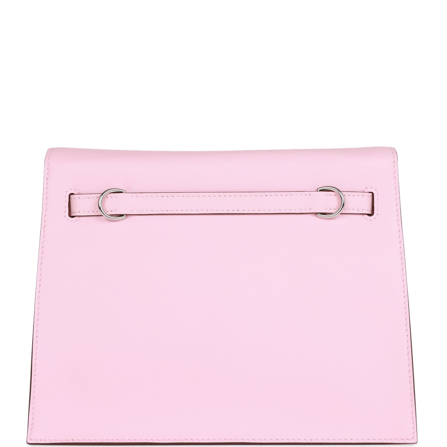 This Kelly Danse II is in Rose Sakura swift leather with palladium hardware and has tonal stitching. two straps with front flap closure and an adjustable flat shoulder strap for multistyle wear.The interior is lined with Rose Sakura lambskin and has a removable Hermes stamped base and an open wall pocket.Collection: ZOrigin: FranceCondition: Pristine; new or never worn (plastic on hardware)Accompanied by: Hermes box. Hermes dustbag. strap. strap dustbag and feltMeasurements: 8.5 width x 6.5 height x 2.75 depth; 1 handle drop