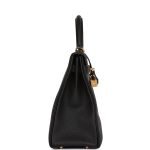 This Kelly. in the Retourne style. is in Black togo leather with gold hardware and has tonal stitching. two straps with front toggle closure. clochette with lock and two keys. single rolled handle and removable shoulder strap.The interior is lined with black chevre and features one zip pocket with an Hermes engraved pull and two open pockets on the opposite side.Collection: U