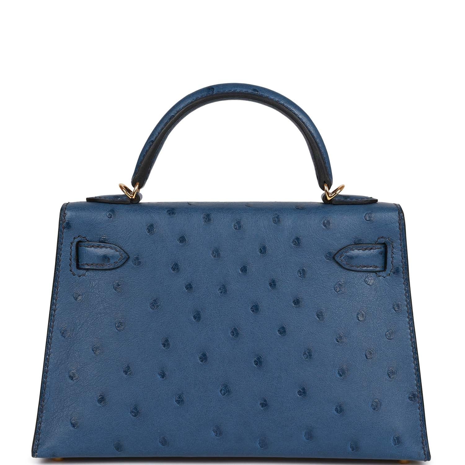 This tiny Kelly. in the Sellier style. is in Bleu Iris ostrich leather with gold hardware and has tonal stitching. two front straps with front toggle closure. single rolled handle and removable shoulder strap.The interior is lined with Bleu Iris lambskin leather and has one open pocket on the back wall.Collection: ZOrigin: FranceCondition: Pristine; new or never worn (plastic on hardware)Accompanied by: Hermes box. Hermes dustbag. shoulder strap. shoulder strap dustbag. felt. carebook. and ribbon.Measurements: 7.5 width x 4.5 height x 2.2 depth; 2.5 handle drop. 18.5 Shoulder Strap Drop
