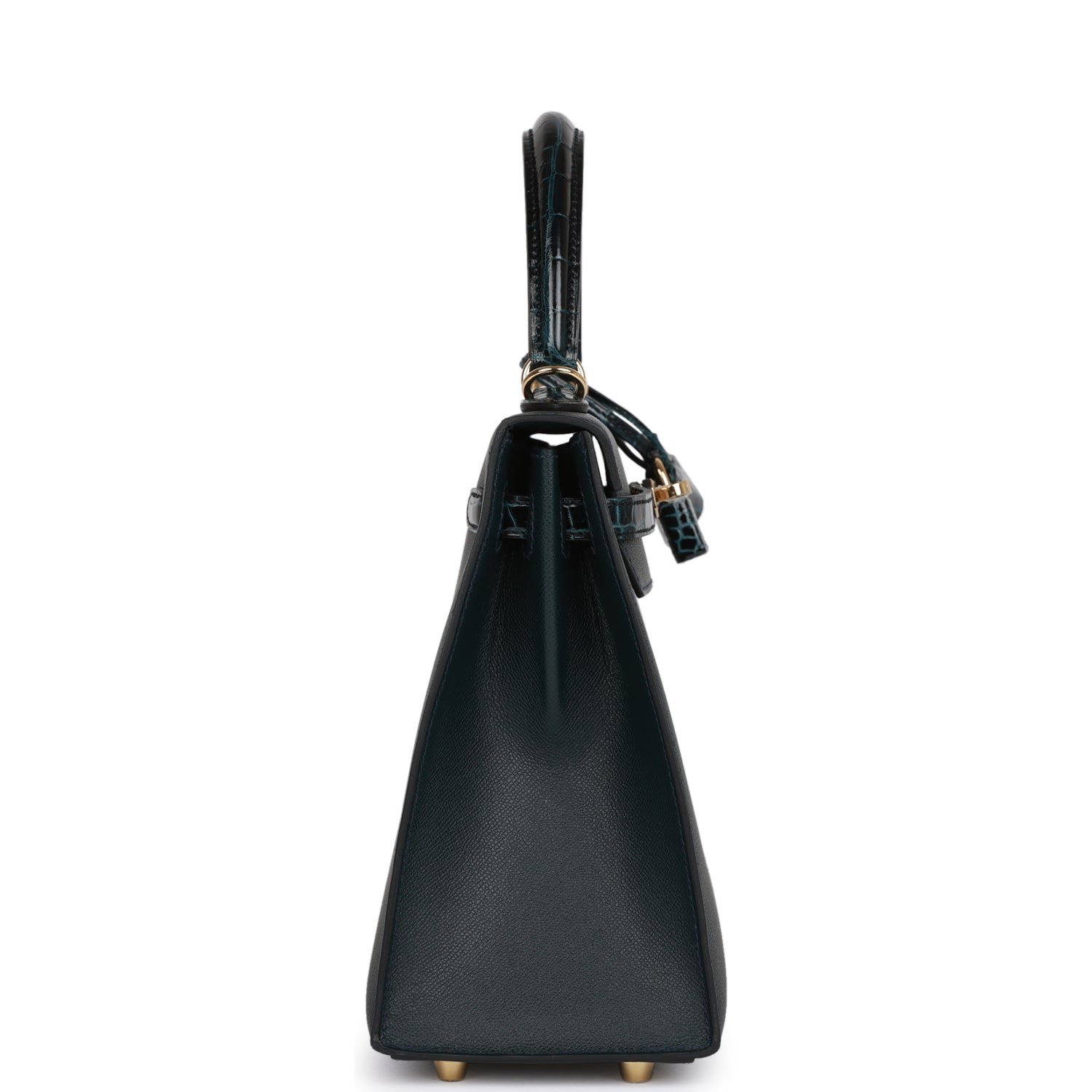 This Kelly. in the Sellier style. is in Vert Rousseau madame leather and shiny niloticus crocodile with gold hardware and has tonal stitching.front flap. two straps with center toggle closure. clochette with lock and two keys. single rolled top handle and removable shoulder strap.