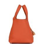 This Picotin Lock is in Orange clemence leather with gold hardware and has tonal stitching with two top handles.The interior is lined with Orange natural leather. no interior pockets and has a pull through closure secured by padlock.Collection: UOrigin: FranceCondition: Pristine; new or never wornAccompanied by: Hermes box. Hermes dustbag. lock. keys. care booklet and ribbonMeasurements: 7 width x 5 height x 7.5 depth; 5 handles