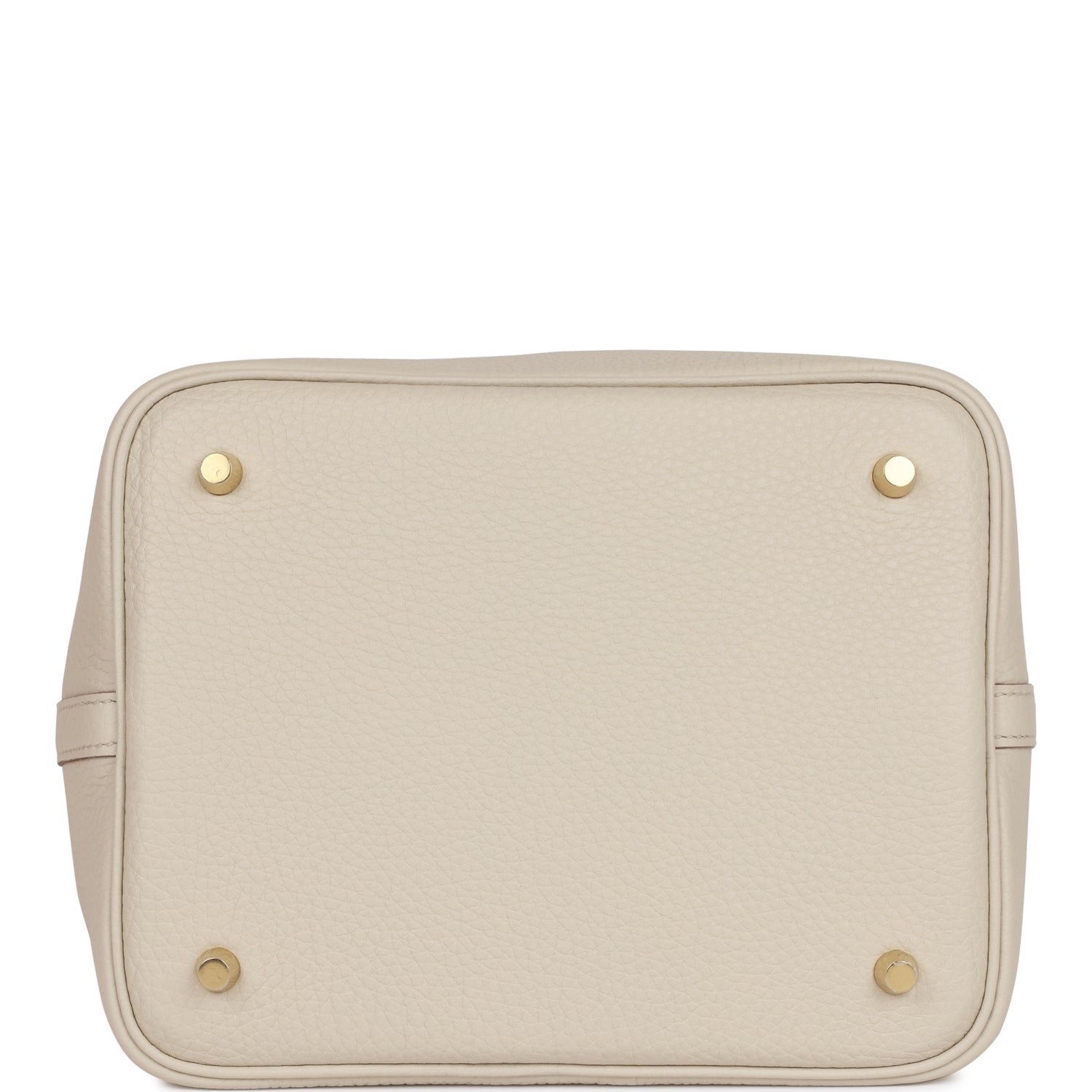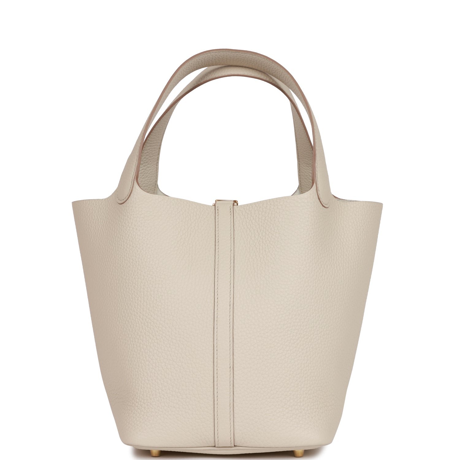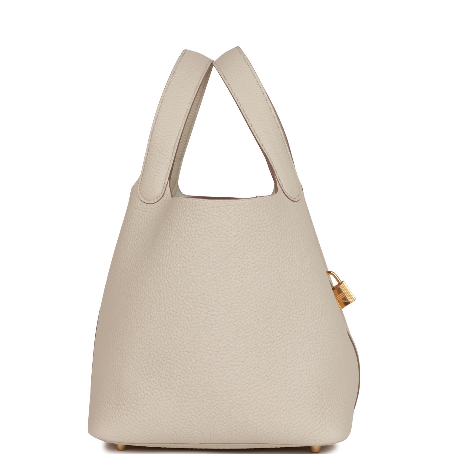 This Picotin is in Beton clemence leather with gold hardware and has tonal stitching with two top handles.The interior is lined with Beton natural leather. no interior pockets and has a pull through closure secured by padlock. Collection: UOrigin: FranceCondition: Pristine; new or never wornAccompanied by: Hermes box. Hermes dustbag. lock. keys. and care bookletMeasurements: 8.3 width x 8.7 height x 6.7 depth; 5 handles