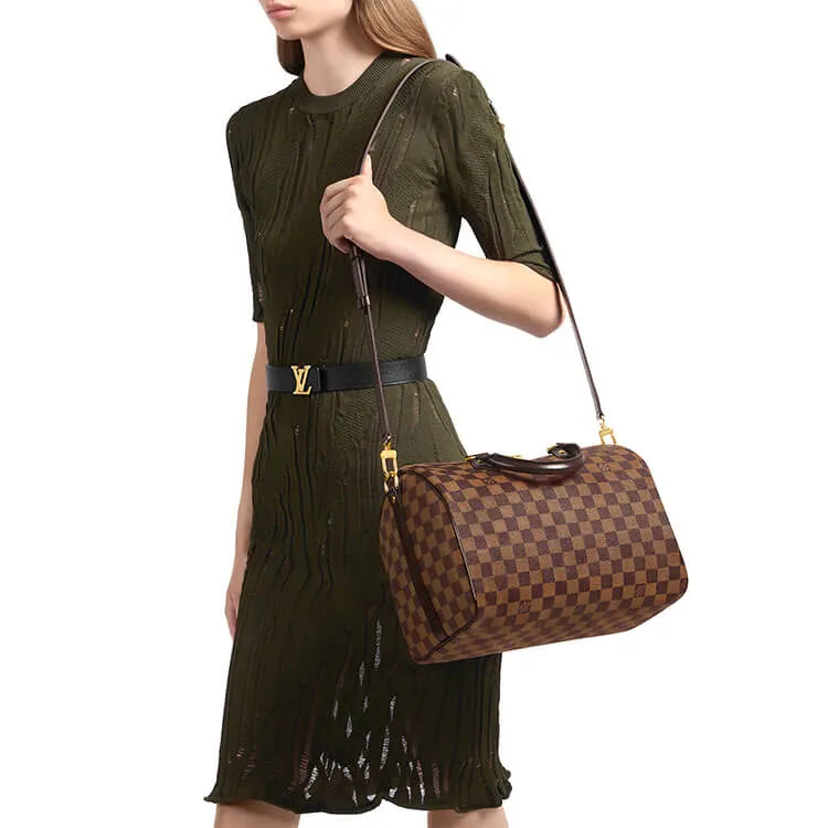 -Description:– In classic Damier Ebene canvas the iconic shape of the Speedy Bandouliere 35 is as elegant as ever. A versatile strap allowing for hand shoulder or cross-body carry ensures its enduring appeal.– Size: 13.8 x 9.1 x 7.1 inches / 35 x 23 x 18 cm– Fearture:– Smooth leather trimmings– Shiny golden brass hardware– Adjustable removable strap and iconic Toron handles– Double-zipped opening with padlock– Interior pocket– D-ring for attaching keys or accessories– Soft textile lining