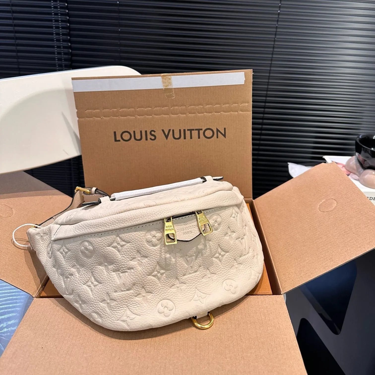This is an LOUIS VUITTON Empreinte BumBag in Creme. This stylish belt bag is created of traditional Louis Vuitton monogram-embossed calfskin leather in off white. The bag features a leather top handle an adjustable waist strap and a rear zipper pocket. The zipper open to a brown microfiber interior. SizeLongest length: 13.25 inHeight: 6.50 inWidth: 3.00 in 33 x 16 x 7 cm Drop: 0.75 inLength: 47.00 in