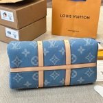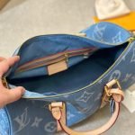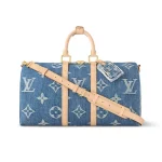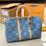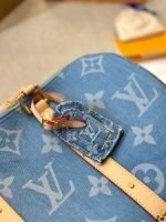 The classic Keepall Bandoulière gets a sporty-chic new look with the Monogram Denim theme. The House’s famous Monogram pattern is printed on certified organic canvas the color of blue jeans creating an eye-catching contrast with the natural cowhide trim. Complete with a padlock and a removable strap this spacious bag is ideal as a carry-on or for short trips.